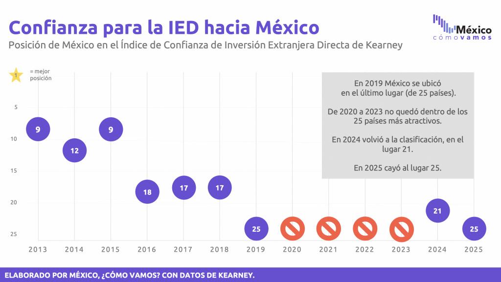 Conforme al Índice de Confianza de Inversión Extranjera Directa (IED), los Estados Unidos, Canadá y Reino Unido son los tres países más atractivos para la inversión extranjera, según la edición 2025 del estudio que realiza regularmente la consultora Kearney, basado en una encuesta entre ejecutivos entre empresas multinacionales. México, llegó a situarse en el top ten de los países con mayor confianza (2013 y 2015); después de cinco años de no figurar, fue clasificado como 21° en el 2024 pero ahora es lugar 25°, siendo superado por Emiratos Árabes Unidos, Arabia Saudita, Singapur, Taiwán e India.