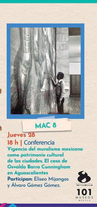 El Museo de Arte Contemporáneo No. 8 será el sitio donde se impartirá la conferencia “Vigencia del muralismo mexicano como patrimonio cultural de las ciudades. El caso de Osvaldo Barra Cunningham en Aguascalientes”, a cargo de Eliseo Mijangos a las 18:00 horas.