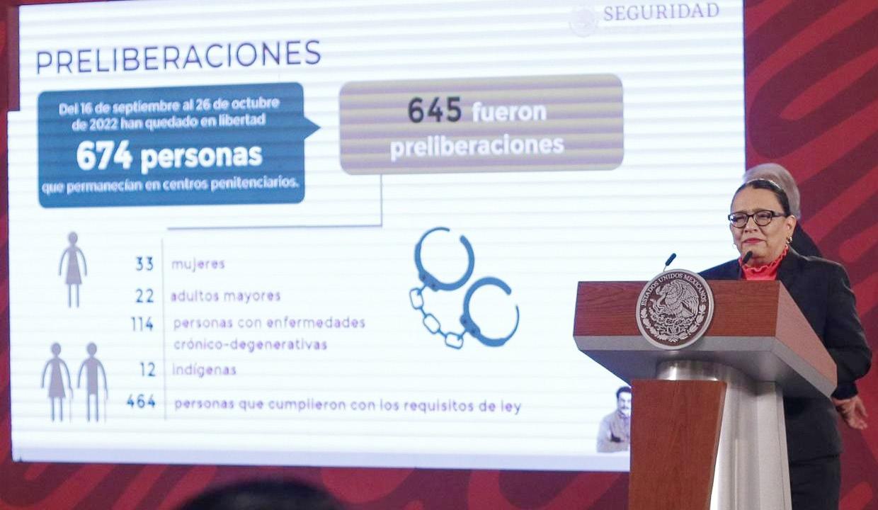 Del 16 de septiembre al 22 de octubre, 674 personas obtuvieron su libertad tras permanecer en centros penitenciarios fe derales y estatales; de este total, 645 se ampararon bajo el mecanismo de prelibe ración, informó la secretaria de Seguridad y Protección Ciudadana, Rosa Icela Rodrí guez Velázquez. Cumplieron con los requi sitos de ley para ser sujetos de liberación 33 mujeres, 22 adultos mayores, 114 personas con enfermedades crónico-degenerativas, 12 indígenas y 464 personas.