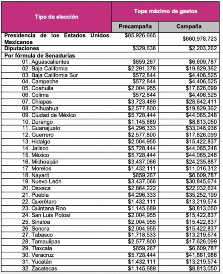 Formal y legalmente aún no hay candidatos a la presidencia de la República, aunque todos sepamos que en la boleta de la elección del 2024 aparecerán por Morena Claudia Sheinbaum y por los prianrredistas Xóchitl Gálvez , pero la maquinaria electoral ya se ha echado a andar, ayer el Instituto Nacional Electoral dio a conocer los topes de gasto de campaña y precampaña para los aspirantes a presidente, senadores y diputados federales, el consejo general que preside Guadalupe Taddei estableció que los candidatos a la presidencia tendrán un tope de hasta 660 millones 978 mil 723 pesos en sus campañas, y 85 millones 926 mil 665 pesos en sus precampañas. Los candidatos a diputados federales podrán gastar hasta 2 millones 203 mil 262 pesos en sus campañas y 329 mil 638 en sus precampañas. En el caso de los senadores, los montos varían de estado a estado, para Aguascalientes, quienes quieran llegar al Senado, en su precampaña podrán erogar hasta 859 mil 267 pesos y en su campaña, hasta 6 millones 609 mil 787 pesos.