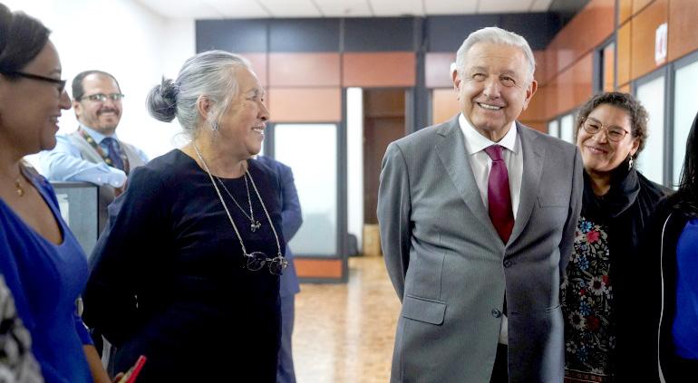 Acompañado de la consejera jurídica del Poder Ejecutivo, María Estela Ríos González, el presidente convocó a las y los servidores públicos a seguir trabajando para que el movimiento de cambio