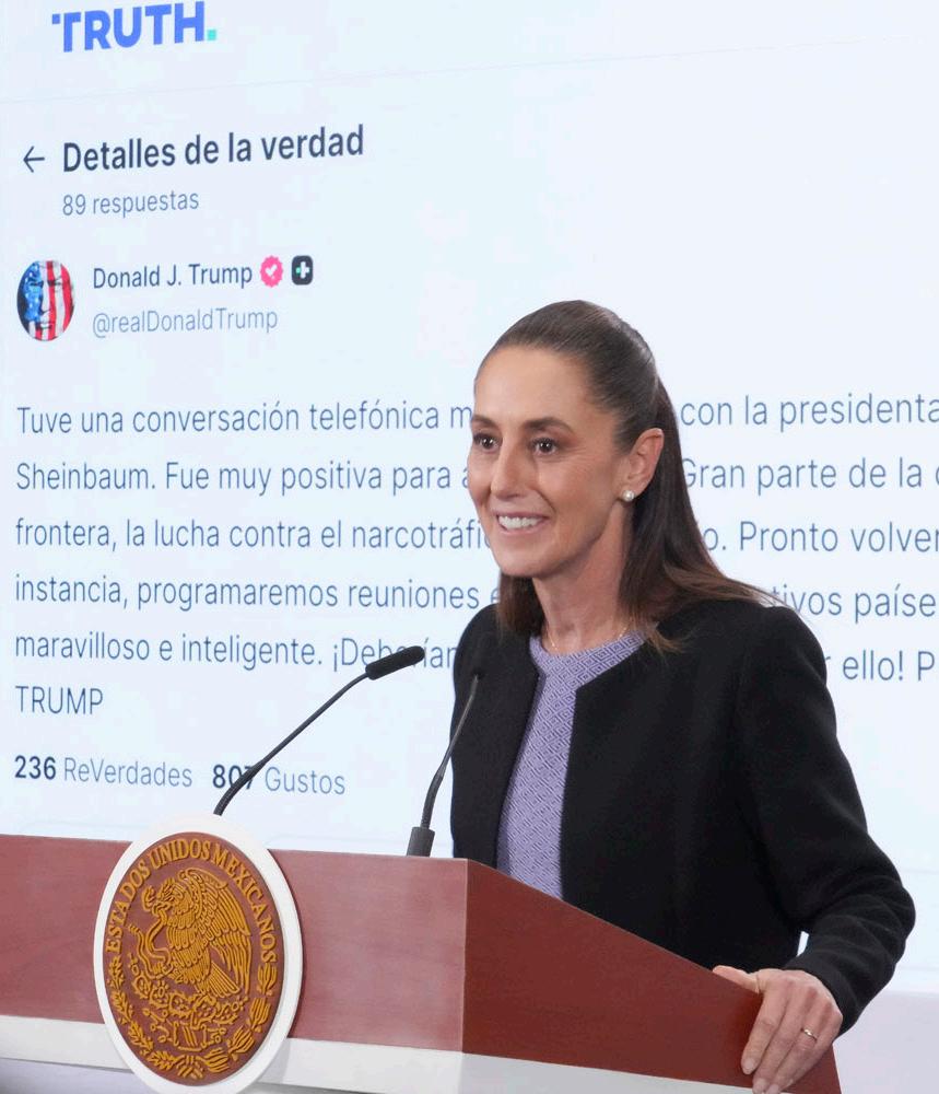 Antes de finalizar la conferencia, la presidenta destacó el mensaje que publicó Trump en redes sociales: “Tuve una conversación telefónica muy productiva con la presidenta de México, Claudia Sheinbaum. Fue muy positiva para ambos países. Gran parte de la conversación se centró en la frontera, la lucha contra el narcotráfico y el comercio. Pronto volveremos a hablar y, en última instancia, programaremos reuniones en nuestros respectivos países. México tiene un líder maravilloso e inteligente. ¡Deberían estar muy contentos por ello!”. A lo que la presidenta destacó: “a alguien no le va a gustar”.