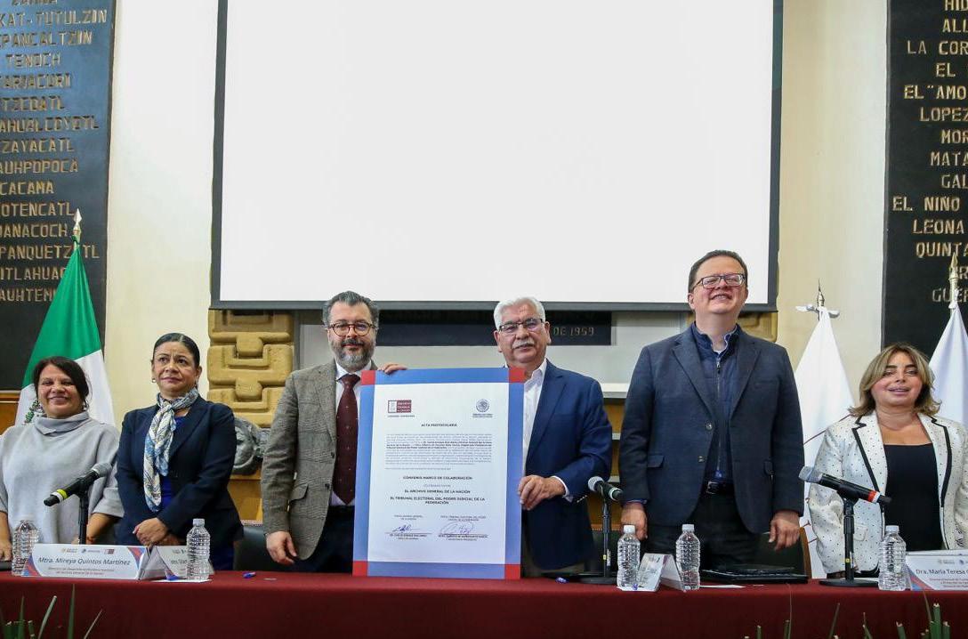 El Tribunal Electoral del Poder Judicial de la Federación (TEPJF) entregó al Archivo General de la Nación (AGN) el dictamen relativo al Cómputo Final de la Elección de la Presidencia de los Estados Unidos Mexicanos de 2024, la Declaración de Validez y la Declaración de la presidenta electa Claudia Sheinbaum Pardo, en el marco de la firma del convenio marco de colaboración entre ambas instituciones, a fin de garantizar el derecho a la memoria pública.