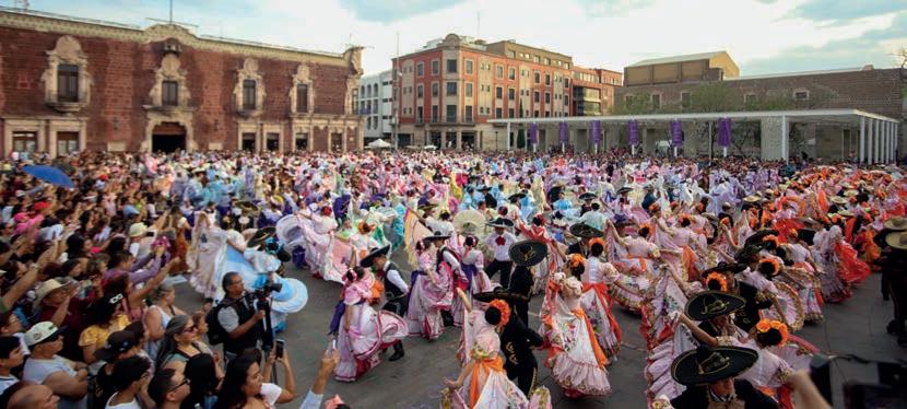 Más de mil 700 bailarines de Aguascalientes, Jalisco, Oaxaca, Chihuahua, Zacatecas y Nuevo León ejecutaron la coreografía Pelea de Gallos Monumental en Plaza de la Patria para rendir homenaje a la disciplina artística de la danza.