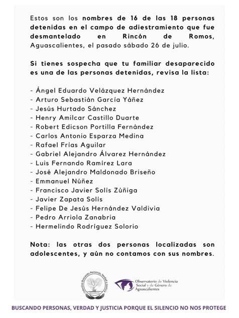 La Fiscalía General del Estado investiga un posible vínculo entre los 18 sujetos detenidos el pasado sábado 26 de julio en un presunto campamento delictivo en Rincón de Romos y al menos cuatro personas reportadas como desaparecidas en la entidad Durante el operativo conjunto del Ejército, la Guardia Nacional y policías estatales, además de los detenidos, se aseguraron armas largas de uso exclusivo del Ejército, chalecos tácticos, municiones e incluso un lanzagranadas, por lo que los detenidos fueron turnados a la Fiscalía General de la República (FGR) al tratarse de un delito federal. En un llamado dirigido a colectivos de búsqueda y a las familias afectadas, la Fiscalía exhortó a quienes tengan un familiar desaparecido a presentarse cuanto antes en sus oficinas para colaborar en el proceso de identificación. Asimismo, se trabaja en coordinación con organismos civiles para intercambiar información y esclarecer si estos cuatro casos derivaron en desaparición forzada o si, por el contrario, las personas en cuestión se integraron voluntariamente a la delincuencia organizada . La Fiscalía reiteró que continuará ampliando las indagatorias, y que cualquier hallazgo se dará a conocer a la brevedad para garantizar justicia y dar respuestas a las familias.