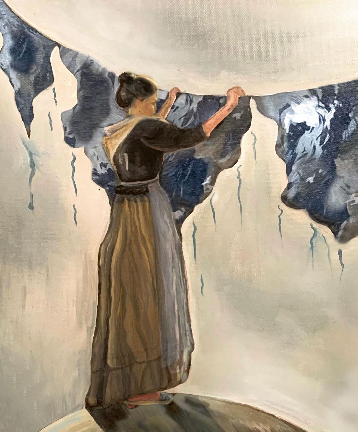 I choose to use the device of irony to carry my voice in this art piece toward the viewers. My piece represents the issue of the rising sea level. It illustrates a scene of a woman hanging the Earth’s surface pieces to dehydrate them. The surface lands are dripping, indicating the significance of melting ice sheets, mountain glaciers and other land-based ice. The planet body of Earth on the bottom left is deserted and dehydrated, cracking. After peeling its planetary skin, the Earth is exposed to its lower crust. Its dismal hypostatic drought emphasizes the importance of water conservation. By portraying the limited water resource and the rising sea level, I want to develop the public’s awareness of the climate and environmental topics, encouraging everyone to contribute to better Mother Earth.