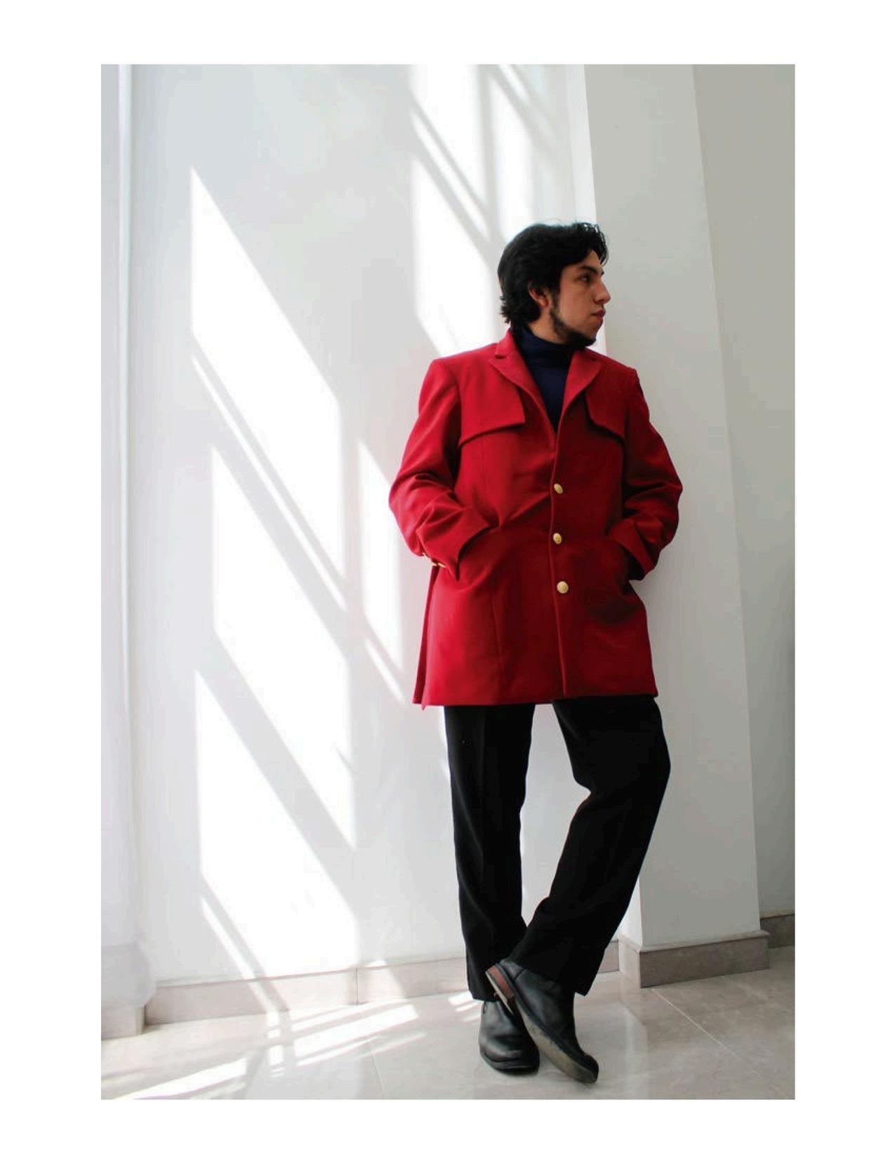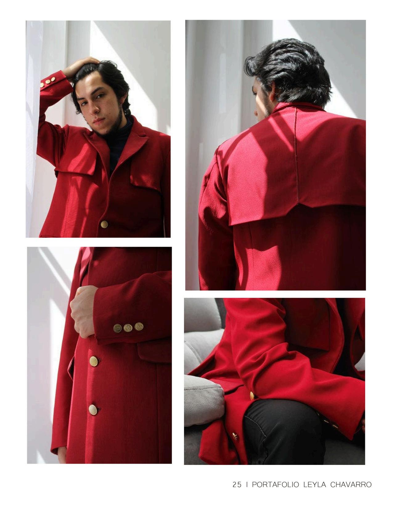 Toma como referencia el concepto de geometría en cortes, aberturas y sobreposiciones, generando una armonía visual enriquecida con colores neutros como blanco y negro, acompañados de acentos vinotinto y azul, que aportan un significado de elegancia, fuerza, equilibrio y a la vez estilizan la silueta masculina.