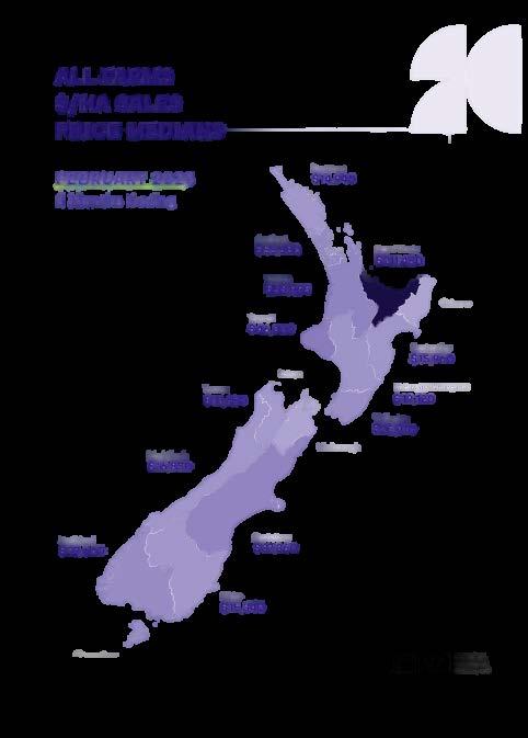 Nine regions experienced an uptick in sales compared to February 2024, with Auckland (+53 sales) and Waikato (+50 sales) leading the way. On the other hand, Nelson/Marlborough (-11 sales) and Gisborne/Hawke’s Bay (-2 sales) saw the most substantial declines in sales over the same period. When comparing to January 2025, five regions reported increased sales.