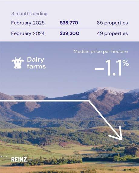 The median price per hectare for all farms sold in the three months to February 2025 was $28,115 compared to $27,620 recorded for the three months ended February 2024 (+1.8%). The median price per hectare decreased by 3.5% compared to January 2025. The REINZ All Farm Price Index increased 0.2% in the three months to February 2025 compared to the three months to January 2025, and 5.2% compared to the three months ending February 2024. The REINZ All Farm Price Index adjusts for differences in farm size, location, and farming type, unlike the median price per hectare, which does not adjust for these factors