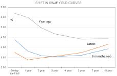 The situation can be best summed up in this following graph It shows the 1-5 year swap rates last year – the grey line – three months ago – the blue line – and now – the orange line Rates are well down from March of 2024 But note how for terms of three years and beyond rates are now above where they were three months ago