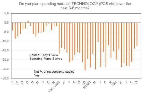 A net 13% of us plan cutting spending on online services. This is better than a net 20% planning cutbacks inJunebutnotethestructuralshiftatthe start of 2022 which has yet to disappear. We are probably still ditching a few things we know we don’t really need.