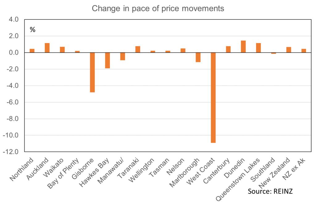We can see that things are improving in Northland, Auckland, Waikato and Bay of Plenty, but still getting worse in Gisborne, Hawke’s Bay, and Manawatu-Wanganui. We also see improvement in Taranaki, Wellington, Nelson, Tasman, Canterbury, Dunedin City, and Queenstown Lakes. But there is still a worsening of price changes in Marlborough, West Coast, and slightly in Southland.