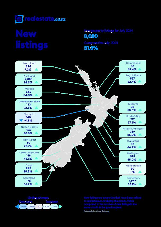 Fourteen of the fifteen regions have seen a rise in new listings year-on-year, with Wellington (+55.0%), Gisborne (+50.0%) and Southland (+36.9%) leading the way. The only region to see a decrease in new listings year-on-year was Taranaki (-4.8%).
