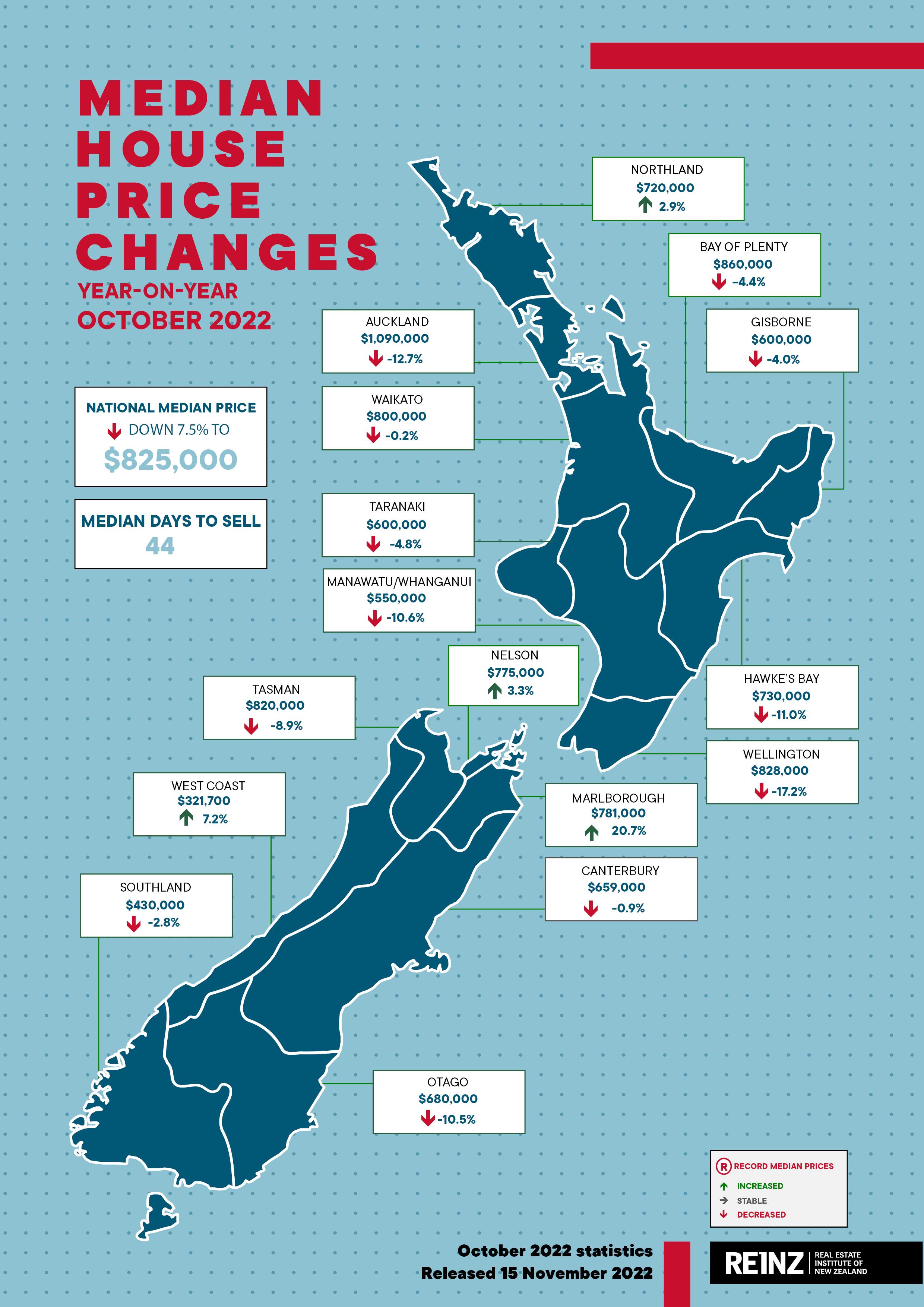 • The median price for residential property in Aotearoa New Zealand decreased 7.5% annually, from $892,000 to $825,000 in October 2022.