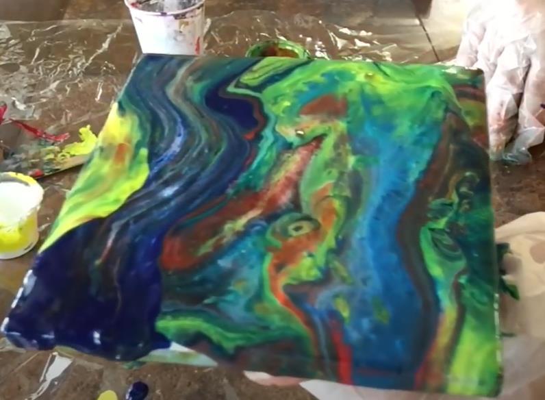 6. Cuando se considera ya hay una suficiente mezcla de los colores según lo deseado, se procede a retirar el bastidor de la piscina y la pintura que antes flotaba sobre el agua, se deposita sobre el lienzo, generando un diseño como el de la imagen No. 16.