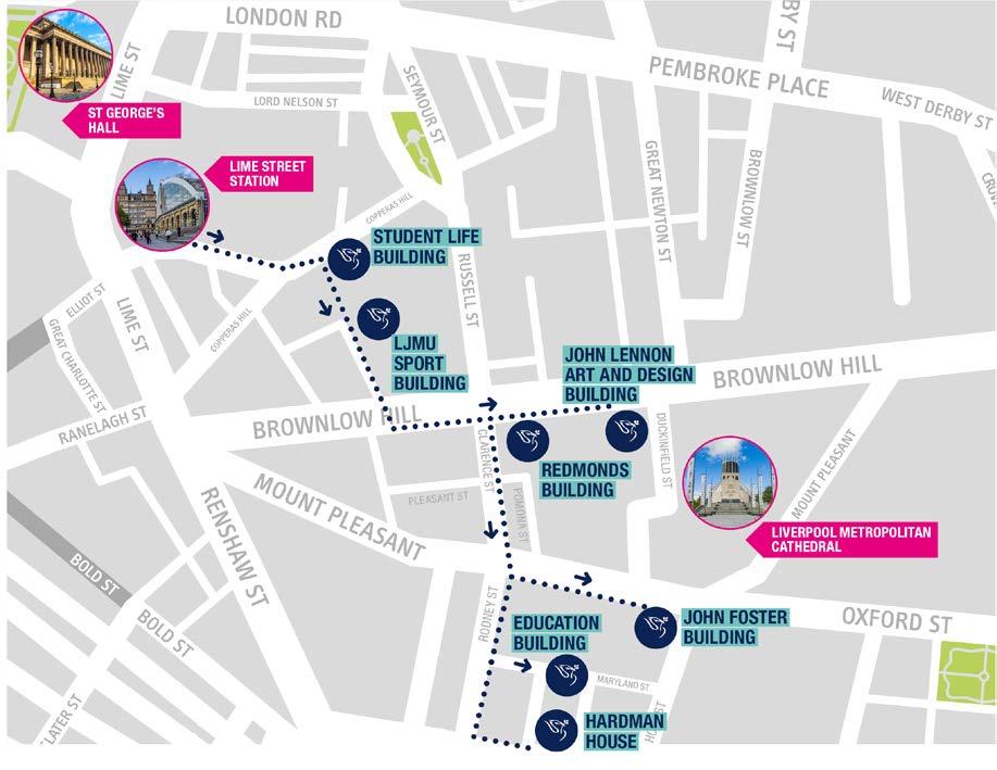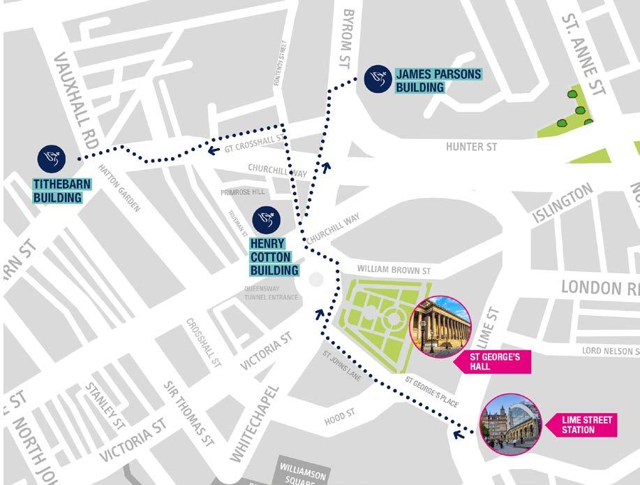 The map shows the route we recommend taking from Liverpool Lime Street station to buildings in our Mount Pleasant Campus.