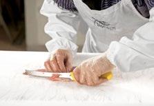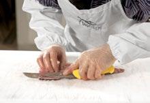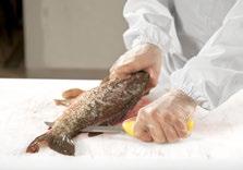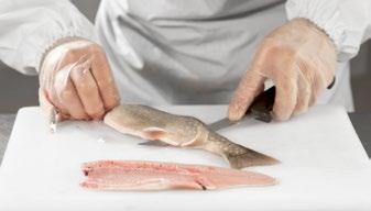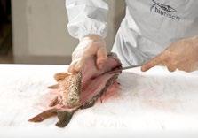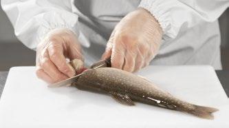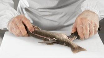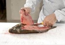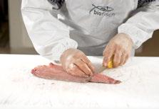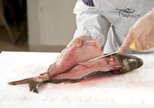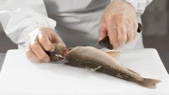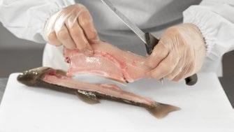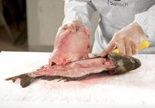 Jetzt wird die Bauchflosse mit dem Knochen und dem „Bauchspeck“ abgeschnitten. Falls es weiße Bindegewebsstellen am Rücken gibt, werden diese weggeschnitten und eventuelle Grätenreste der Rückenund Afterflossen ebenfalls. Sie haben jetzt ein schönes, sauberes und ansprechendes Filet.