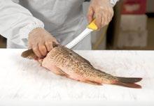 Parieren nennt man das Entbeinen und Zuputzen der Filets. Sie haben jetzt ein schönes, meist großes Stück Filet, das Sie in passende Portionen schneiden können. Im Fleisch des Karpfens liegen noch Gräten, die durch Schröpfen des Filets ungefährlich gemacht werden können.