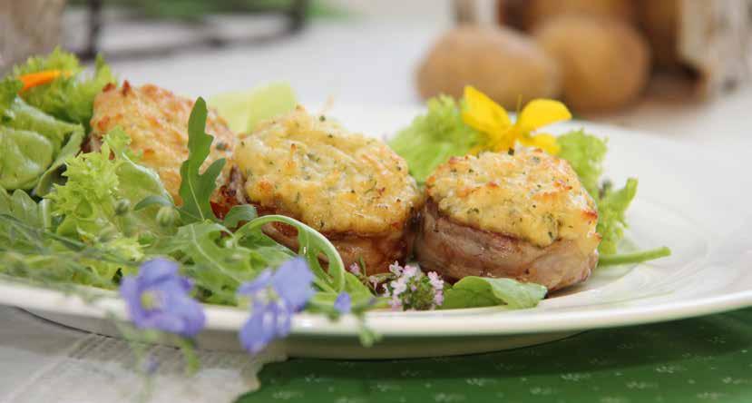 Schweinslungenbraten zuputzen und in ca. zwei Zentimeter dicke Scheiben schneiden. Mit Salz und Pfeffer würzen und mit je einer Scheibe Speck umwickeln. Für die Erdäpfelkruste die Erdäpfel kochen, schälen und durch die Erdäpfelpresse drücken. Mit einem Ei, fein geriebenem Hartkäse, gepressten Knoblauchzehen, Mehl und fein gehackten Kräutern gut durchmischen.