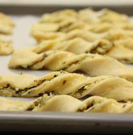 DiezweiteTeighälftedarüberschlagenundgutandrücken,nochmals mit Ei bestreichen. Mit einem Teigrad ca. zwei Zentimeter breite Streifen herunterschneiden und mehrmals drehen. Mit gehackten Kürbiskernen und mit wenig grobem Salz bestreuen. Auf ein mit Backtrennpapier belegtes Backblech legen und im vorgeheizten Rohr bei 210 °C ca. 15 Minuten backen.