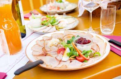 Saisonales Angebot – Wild, Fisch, verschiedene Salate; Käse vom Bauern, Kümmelbraten nach Art des Hauses, große Angebotspalette an Qualitätsweinen, Edelbrände und Fruchtsäfte aus eigener Erzeugung