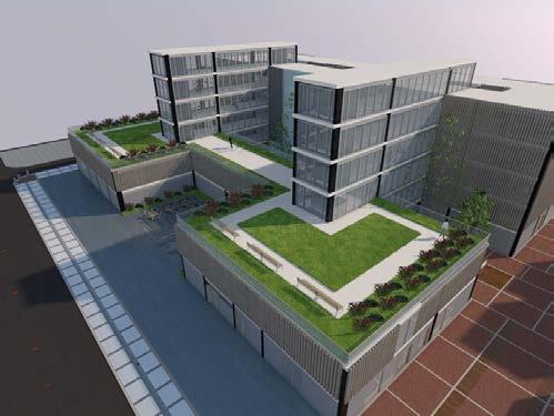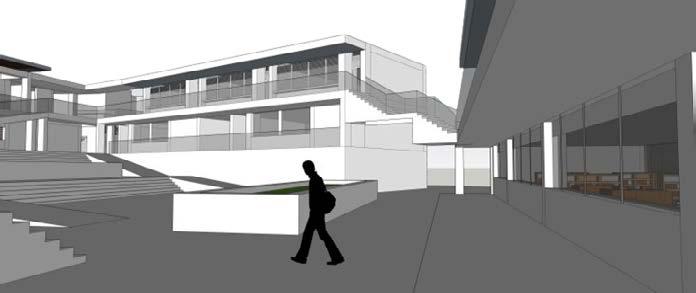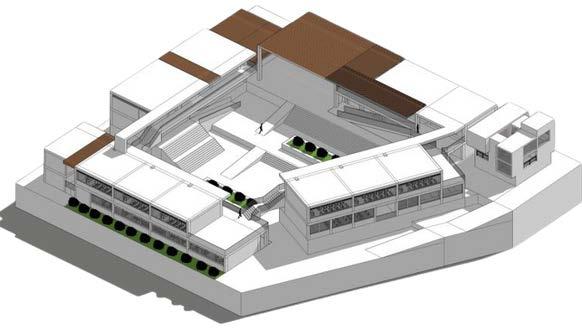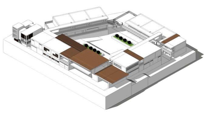 aqui se muestra el colegio ya finalizado con sus espacios verdes dentro del proyecto y como se remarca el acceso con una celosia, tambien se puede apreciar las rampas para personas con movilidad reducida y como se remarca la conexion con los diferentes espacios del proyecto