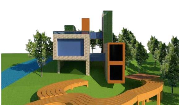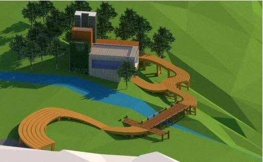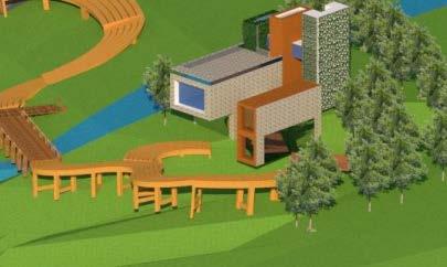 aqui se muestra el mirador y como se ve integrado al terreno del parque con la materialidad de madera da una integracion a la naturaleza del parque tambien se da el desarrolo de la maquea virtual renderizada y tambien la maqueta a mano en como se da el proceso y la finalidad de la mis ma.