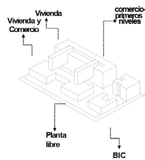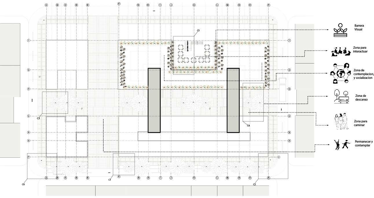 El mobiliario es pllanteado con el fin de dar una zona de descanso y crear un orden, acompañado de naturaleza para mejorar el ambiente, ya sea dentro del proyecto o en el exterior.