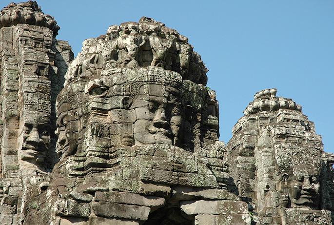 Pár kilométerre egy másik ritkasággal szembesülhet a turista, a Bayon-templom szépen restaurált épületével. Öt vennégy tornyán 216 óriási, sőt gigantikus méretű mosoly gó arc néz vissza. Döbbenetes élmény.
