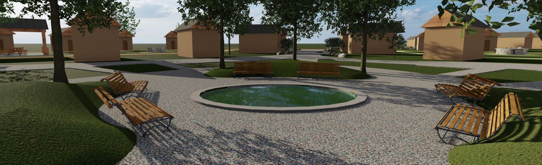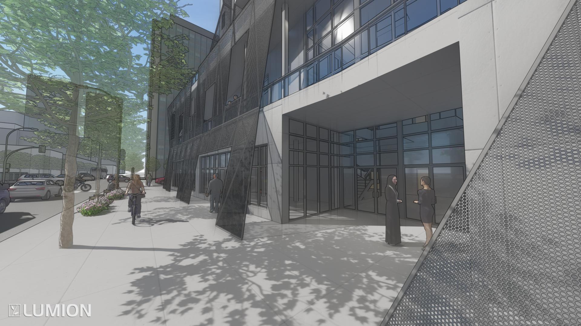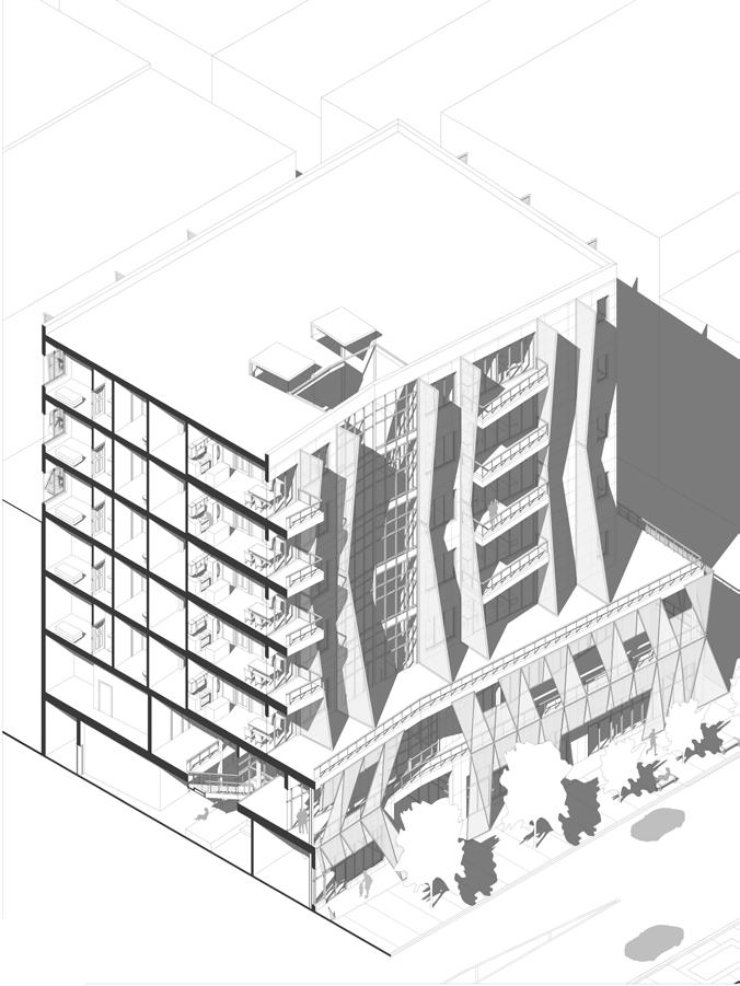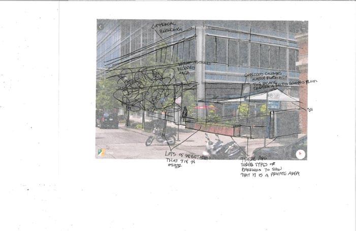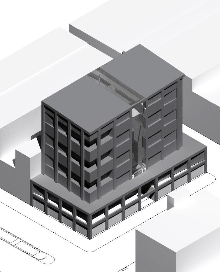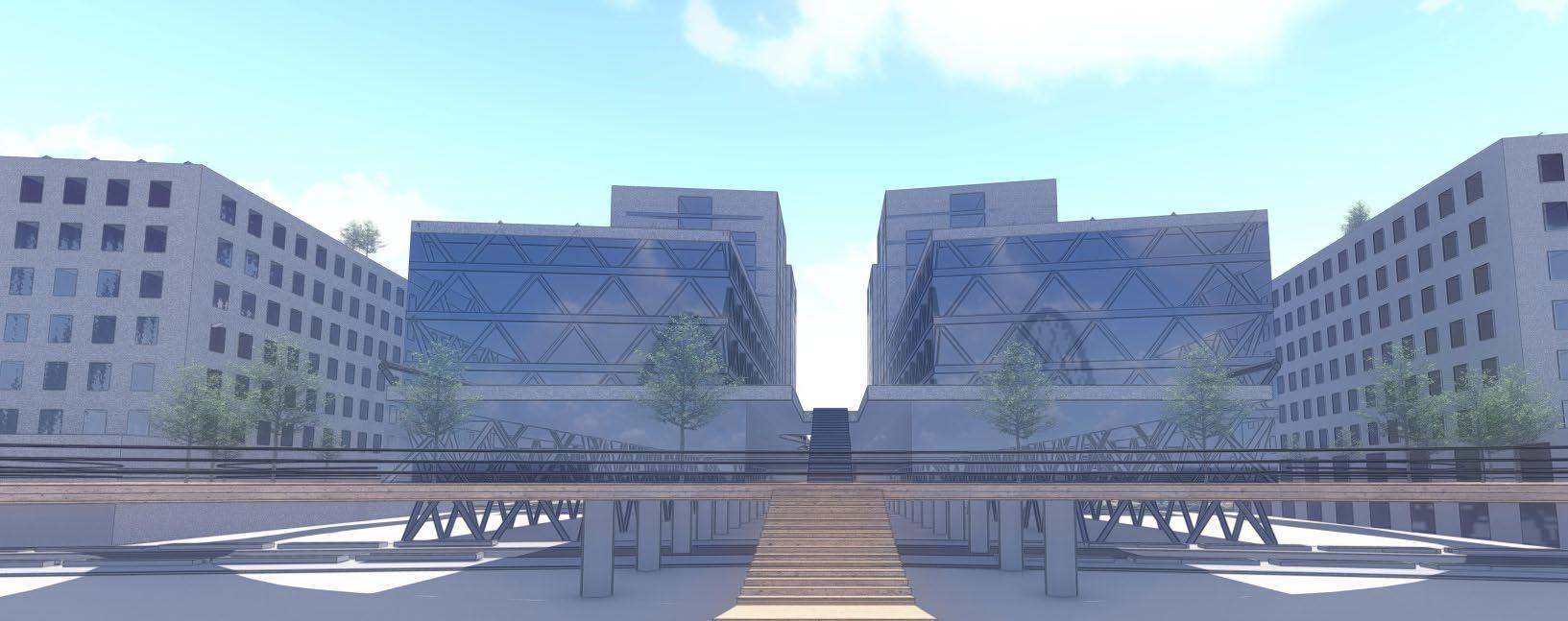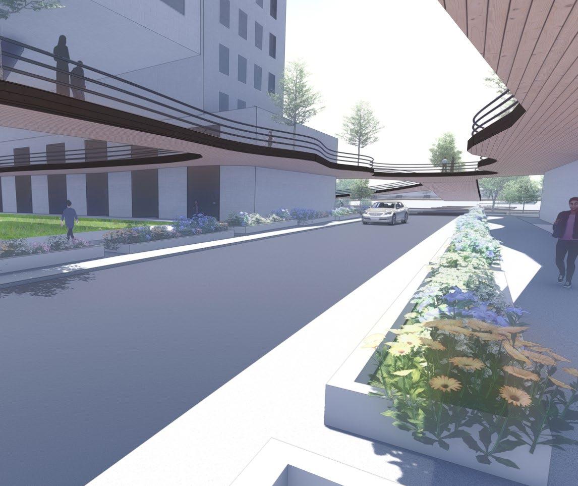 sac. I was in charge of designing the community centers within the cul de sacs. Next, we needed to decide where the places of work needed to go. Here, I was in charge of designing the administrative building, which was meant to be the main building people see when they entered the site. The way we grouped the cul de sacs in relation with to each other and the grouping of the places of work were meant to represent a flower blooming. Within the over master plan, my team decided to add water into the site to add some tranquility into the lives of the residence. Additionally, I created the 3d model as well as the 3d rendering.