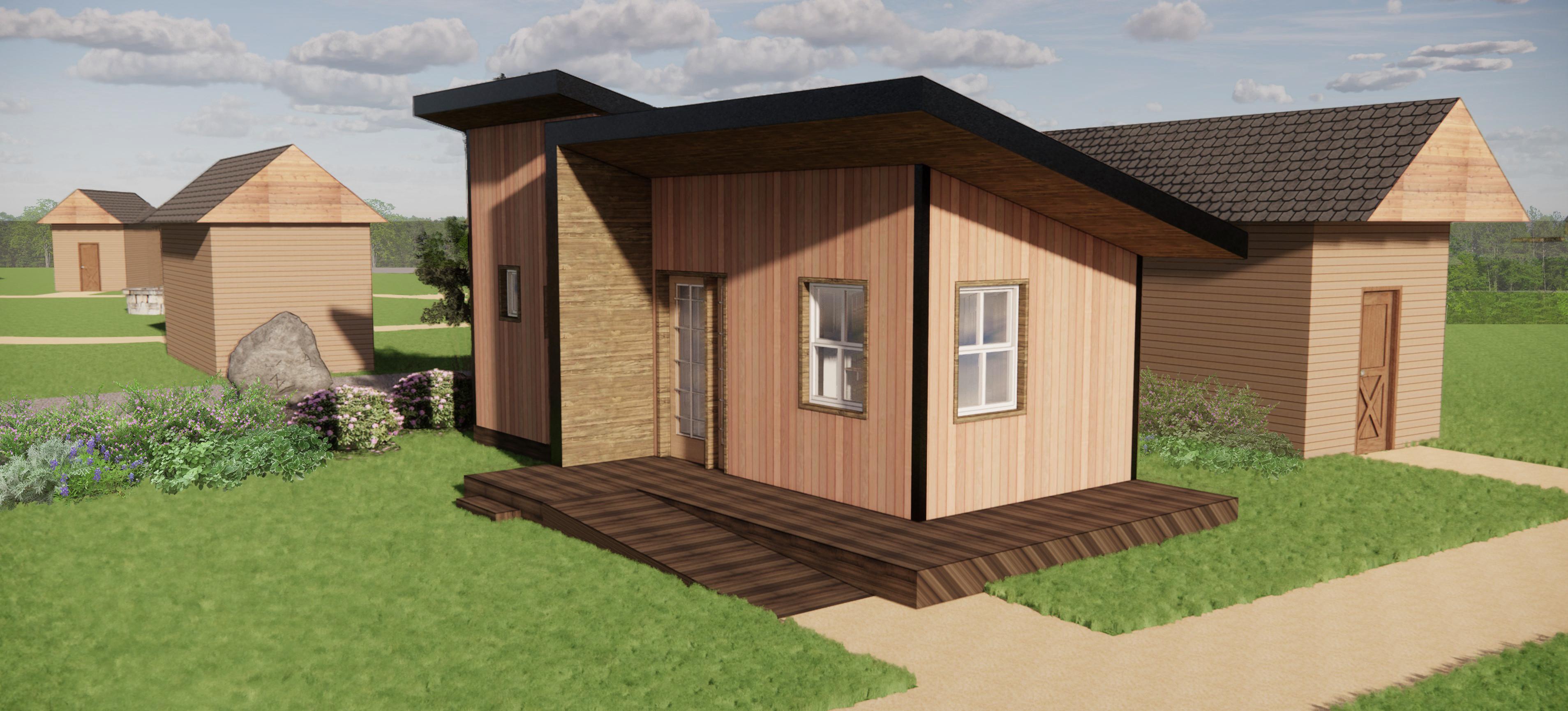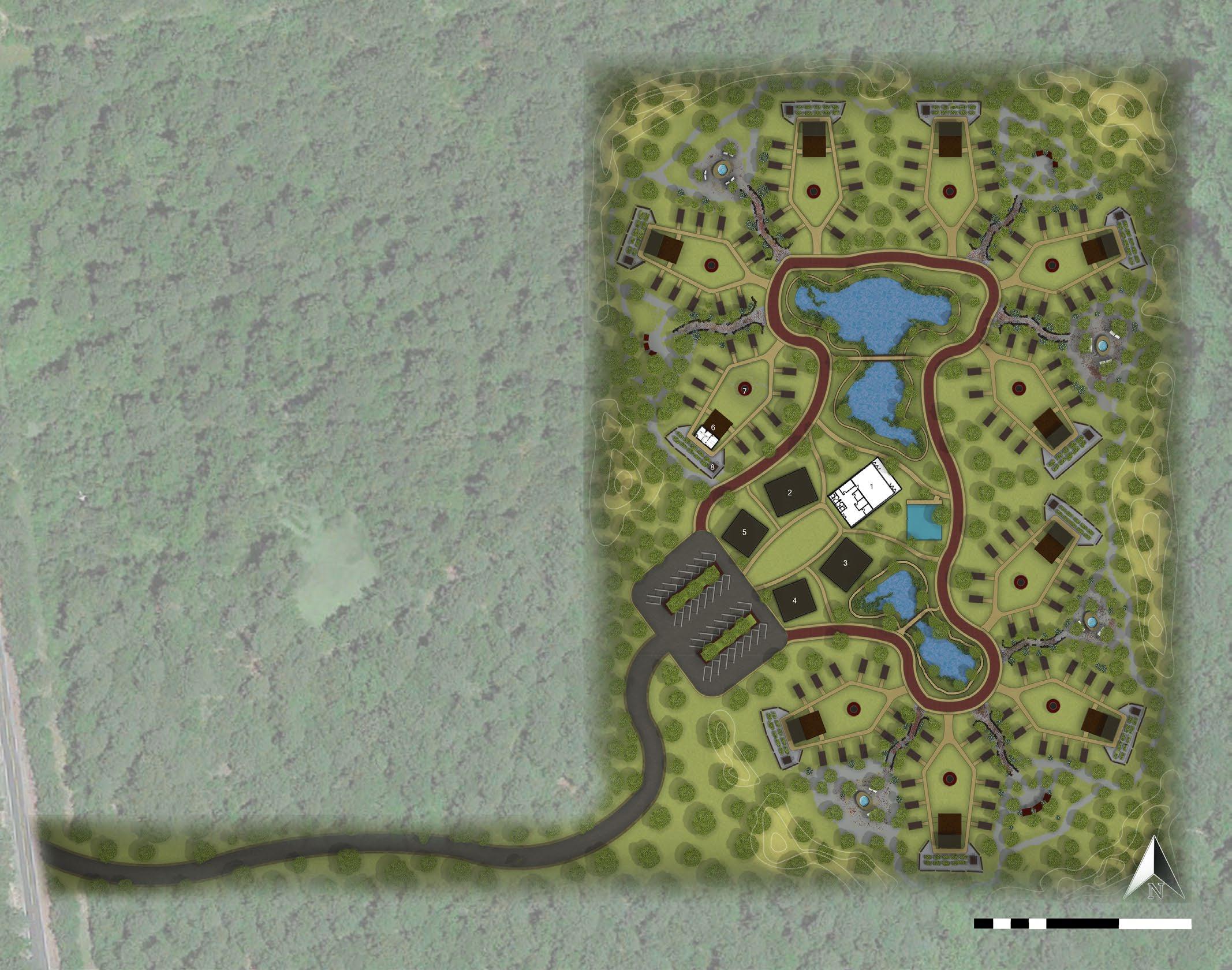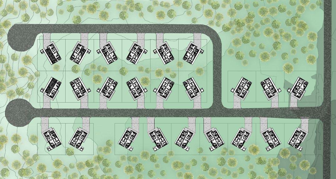 For this project, my team and I were assigned to take a given site with its existing conditions and design a tiny house community for the homeless community in Shreveport, Louisiana. The site was roughly 60 acres. We were asked to create a master plan for the site that not only included living quarters but also amenities such as places of work and community Gathering spaces. For the living quarters, we needed to design ten cul de sacs that would hold ten tiny houses each. Each cul de sac must also include a xcommunity center with space for a kitchen and bathroom. My team first had to decide on the shape and placement of each cul de