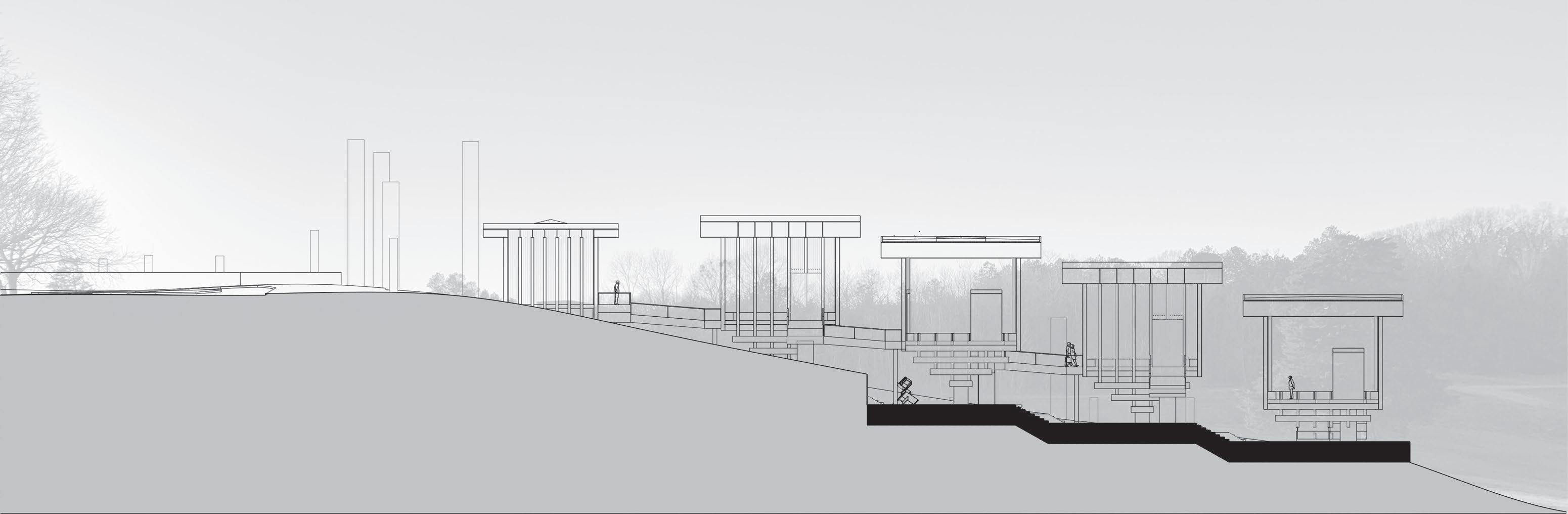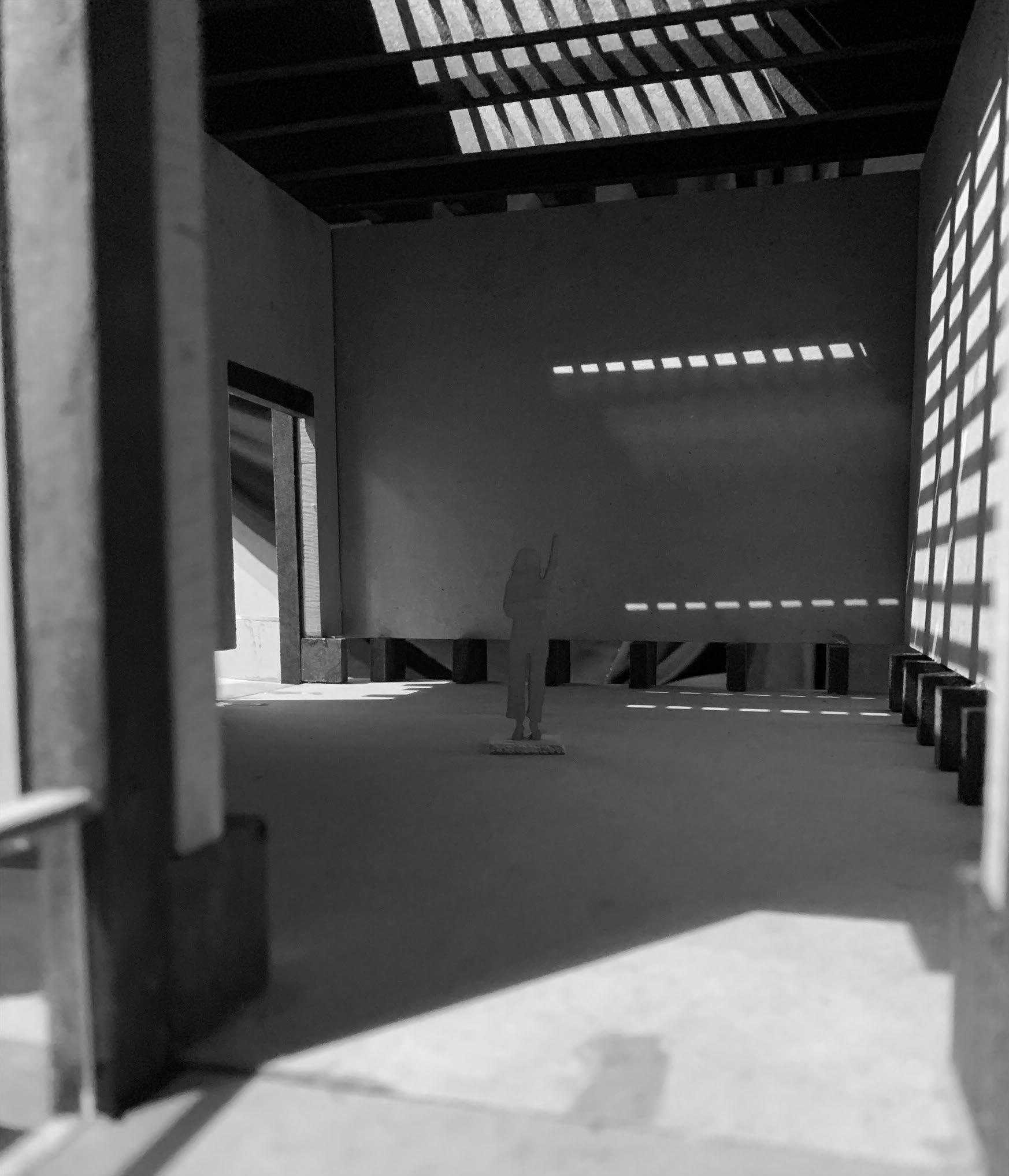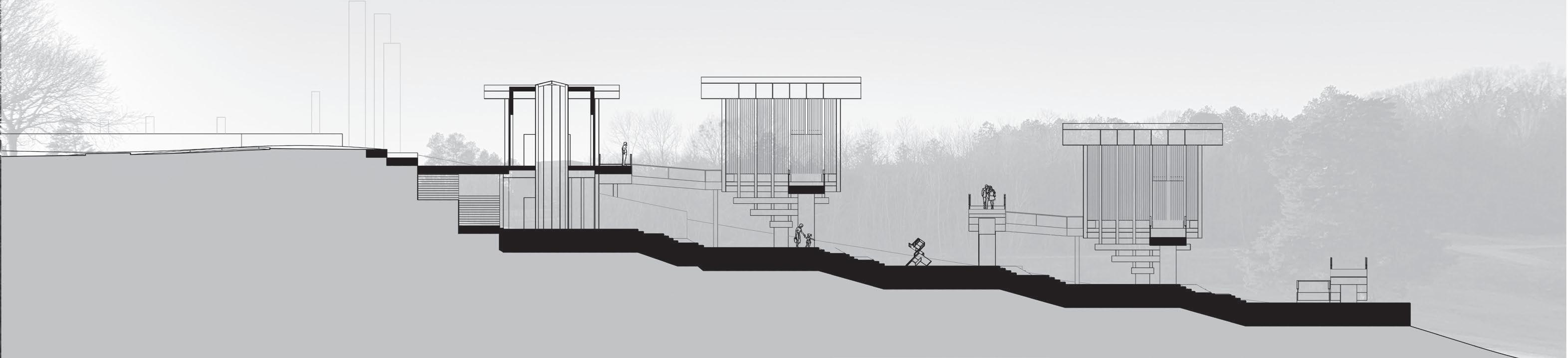 other hand, the sculpture garden is embedded in the the ground to be closer to the nature that surrounds the musum. The user is allowed to take their own journey throughout the art museum as well as the site. The main lobby building is made up of two parts, partically in the ground and above. It holds the main entrance and lobby, a gift shop, and small eatery. Each gallery allows for indirect light through the elevated walls and raised roof. Light floods in through the floor and ceiling, creating a floating sensation.