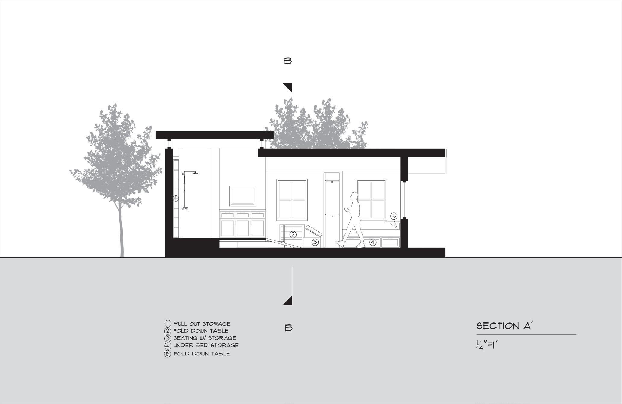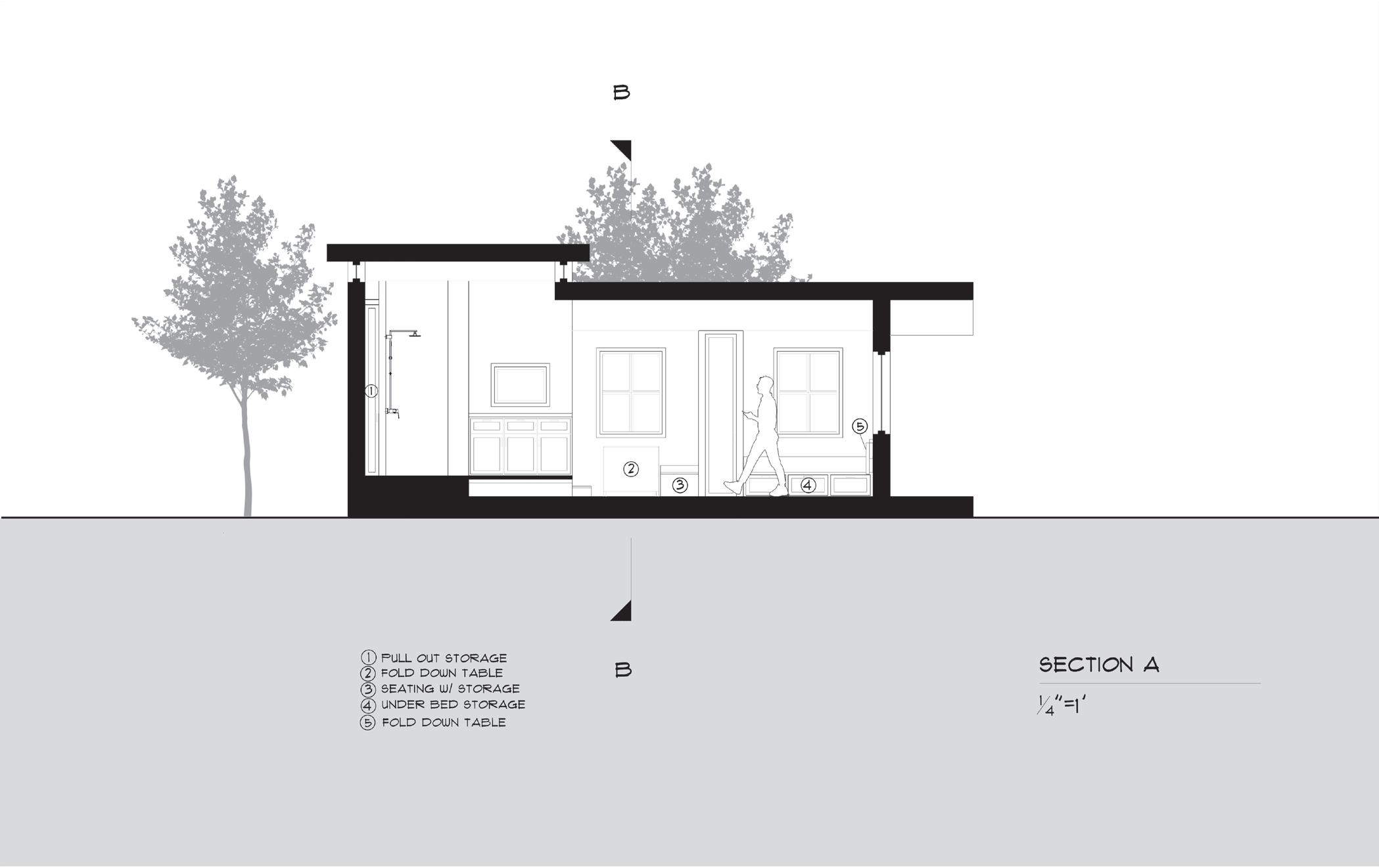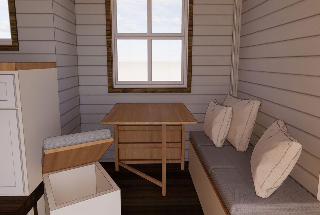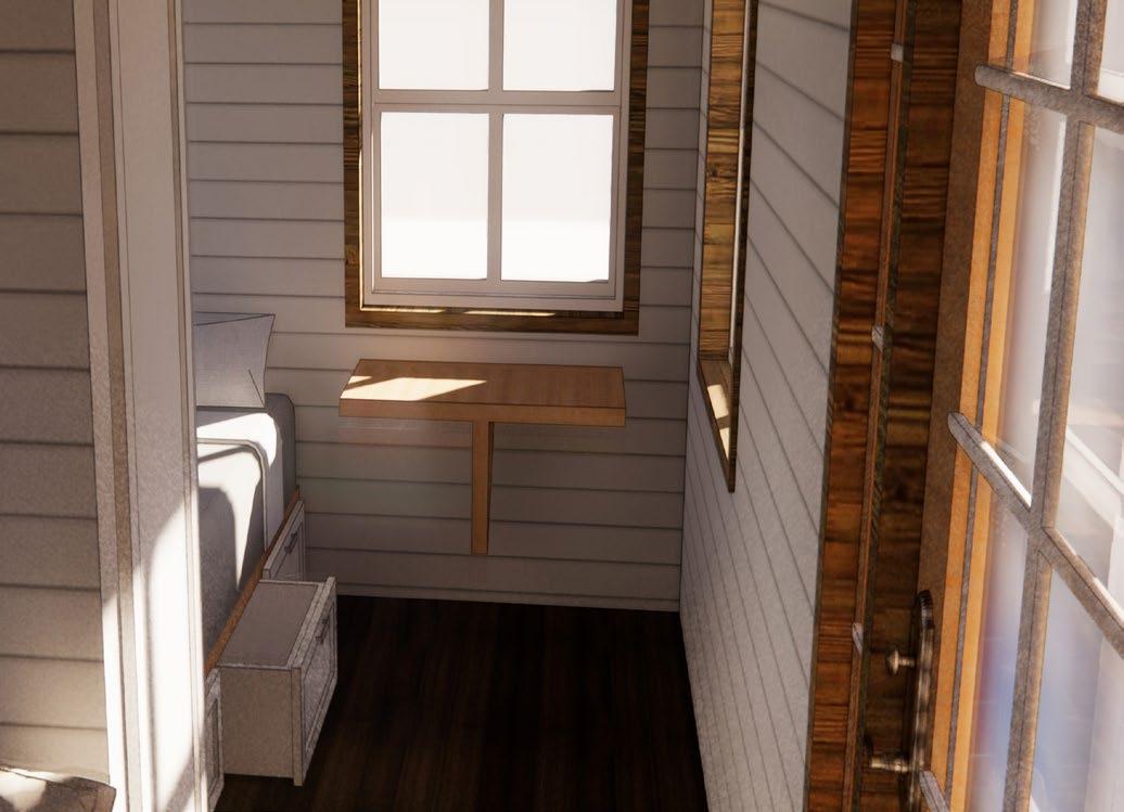 and the bed itself can be lifted up for larger storage. The pull out closet create a separation between the sleeping area and the rest of the tiny house, giving the residence some privacy.The wall mounted tables in the living area and sleeping areas are foldable to create more space when needed. I also made the tiny house as close as possible to wheelchair assessible. Even though the kithcen area is raised, I designed a pull out ramp from under the kitchen floor. double as a storage. for example, there is pull out storage under the kitchen floor and bed frame. Other