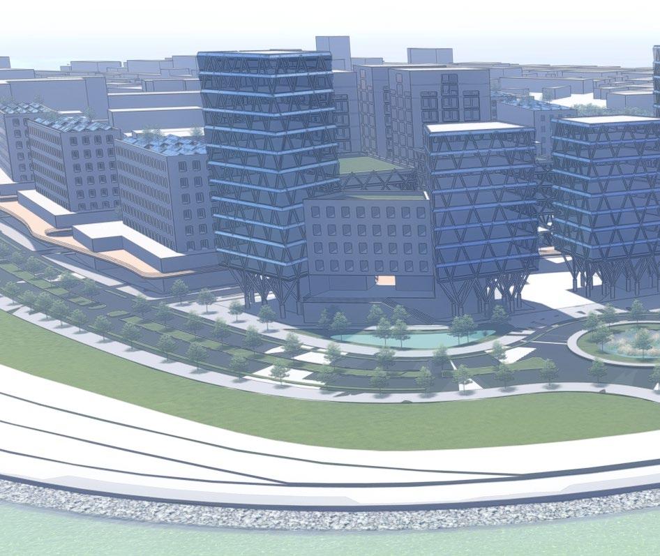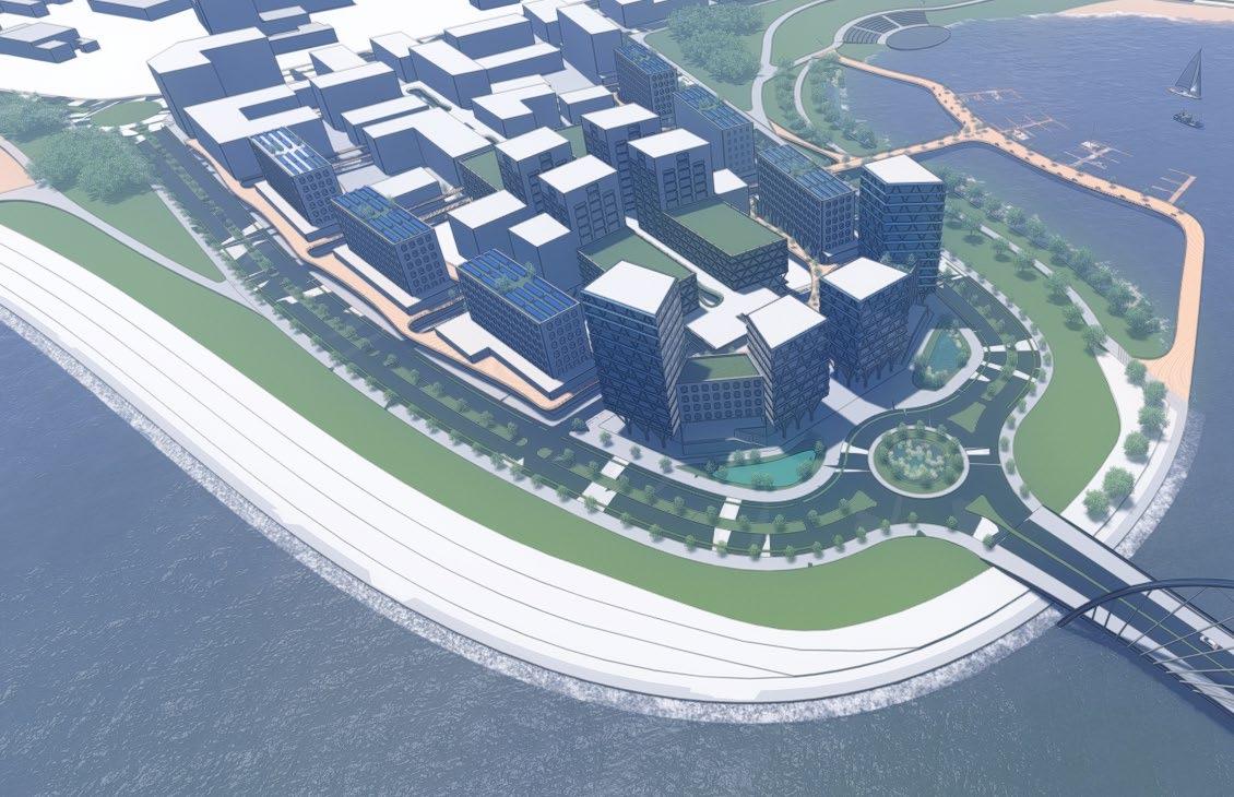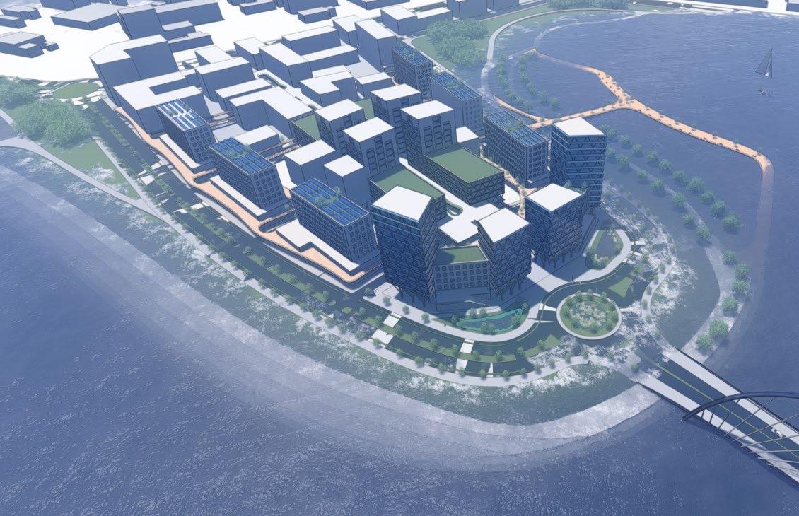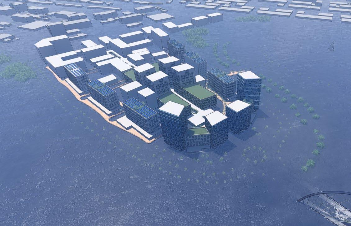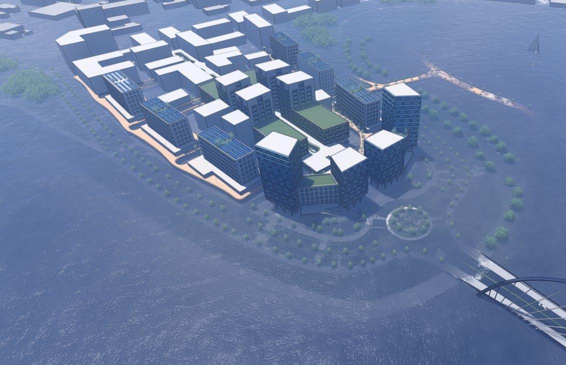 as well as adding some nature into the high-density development. There is two planes of living: the ground plane and an elevated plane. The ground plane is floodable while the elevated plane is protected. The first level of all the development is designed to be able to flood while the rest of the development is safe from storm surges. Along all the streets, there are bioswales for additional stormwater management. There are walks and parks all around the peninsula while a beach can exist in portions. The midrise high-density development will include BlueTech companies, dense residential, shops, and other businesses. Additionally, many of the buildings will have green roof and solar panels to help improve the quality of living in the bay area. This site activates several planes of living.