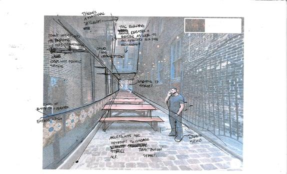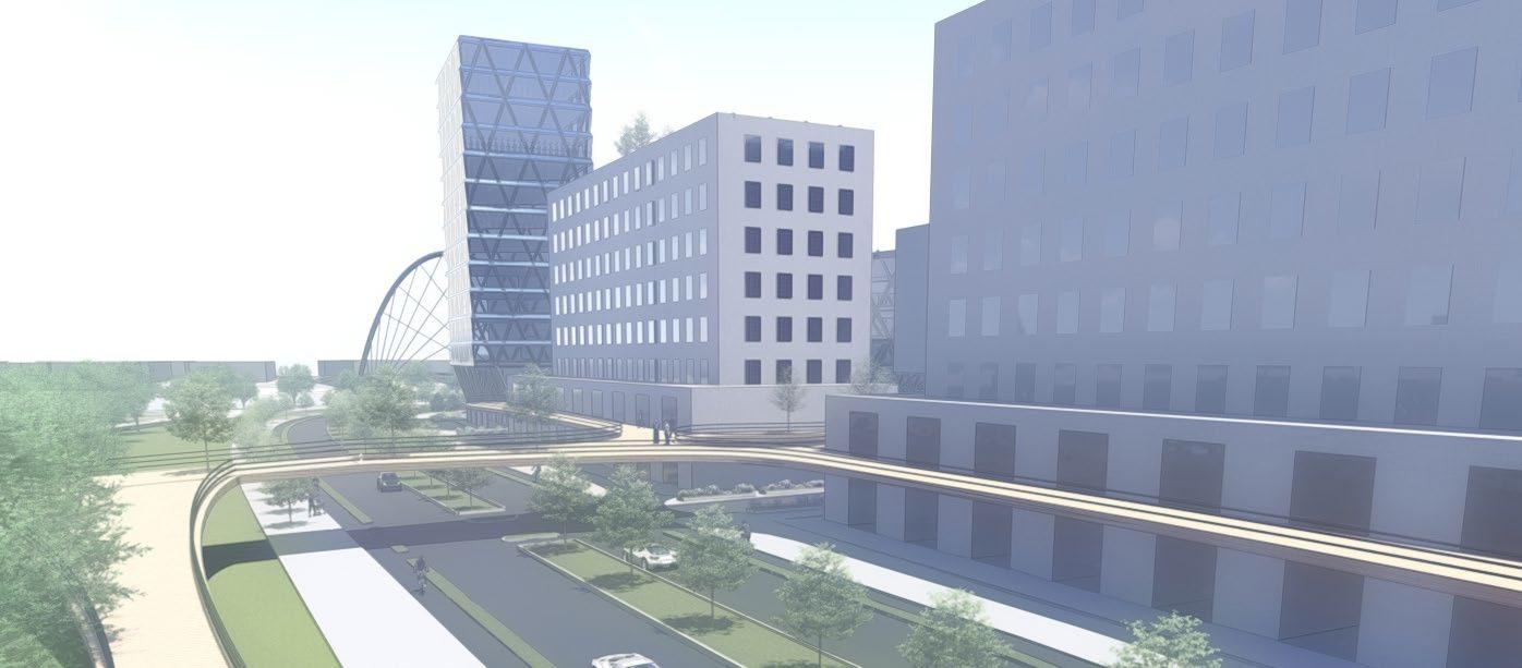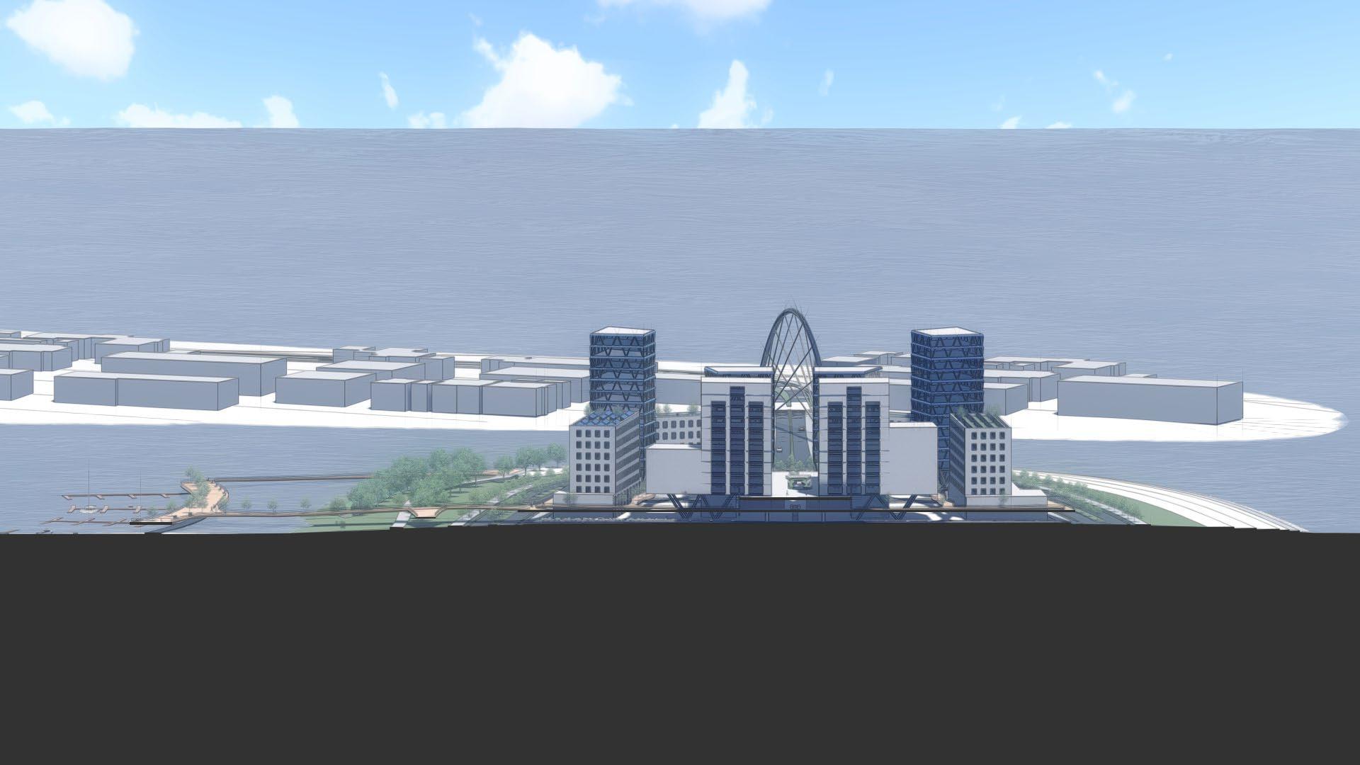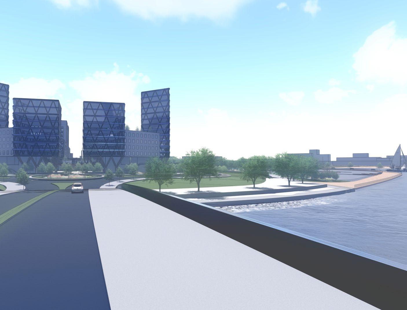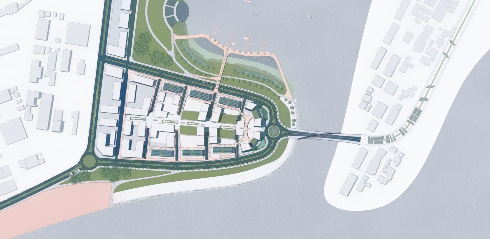 as well as adding some nature into the high-density development. There is two planes of living: the ground plane and an elevated plane. The ground plane is floodable while the elevated plane is protected. The first level of all the development is designed to be able to flood while the rest of the development is safe from storm surges. Along all the streets, there are bioswales for additional stormwater management. There are walks and parks all around the peninsula while a beach can exist in portions. The midrise high-density development will include BlueTech companies, dense residential, shops, and other businesses. Additionally, many of the buildings will have green roof and solar panels to help improve the quality of living in the bay area. This site activates several planes of living.