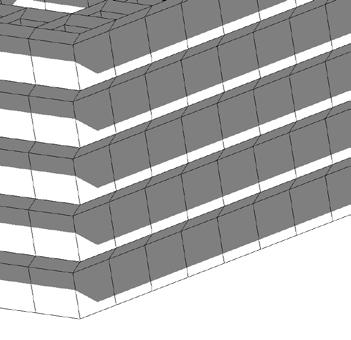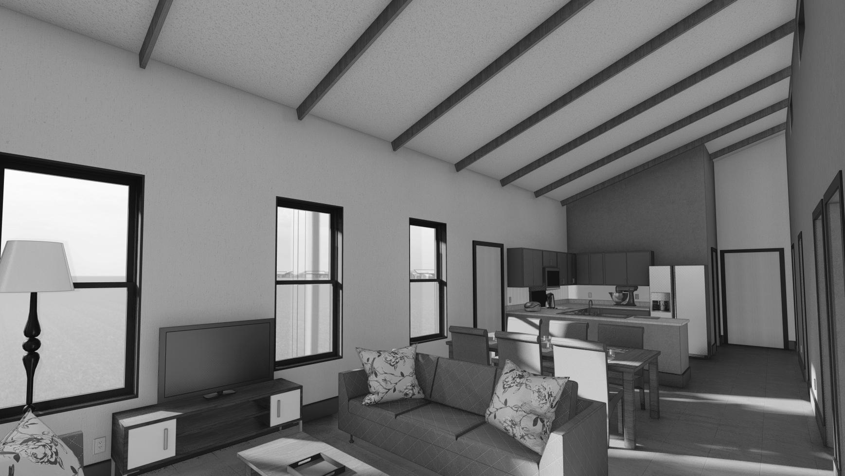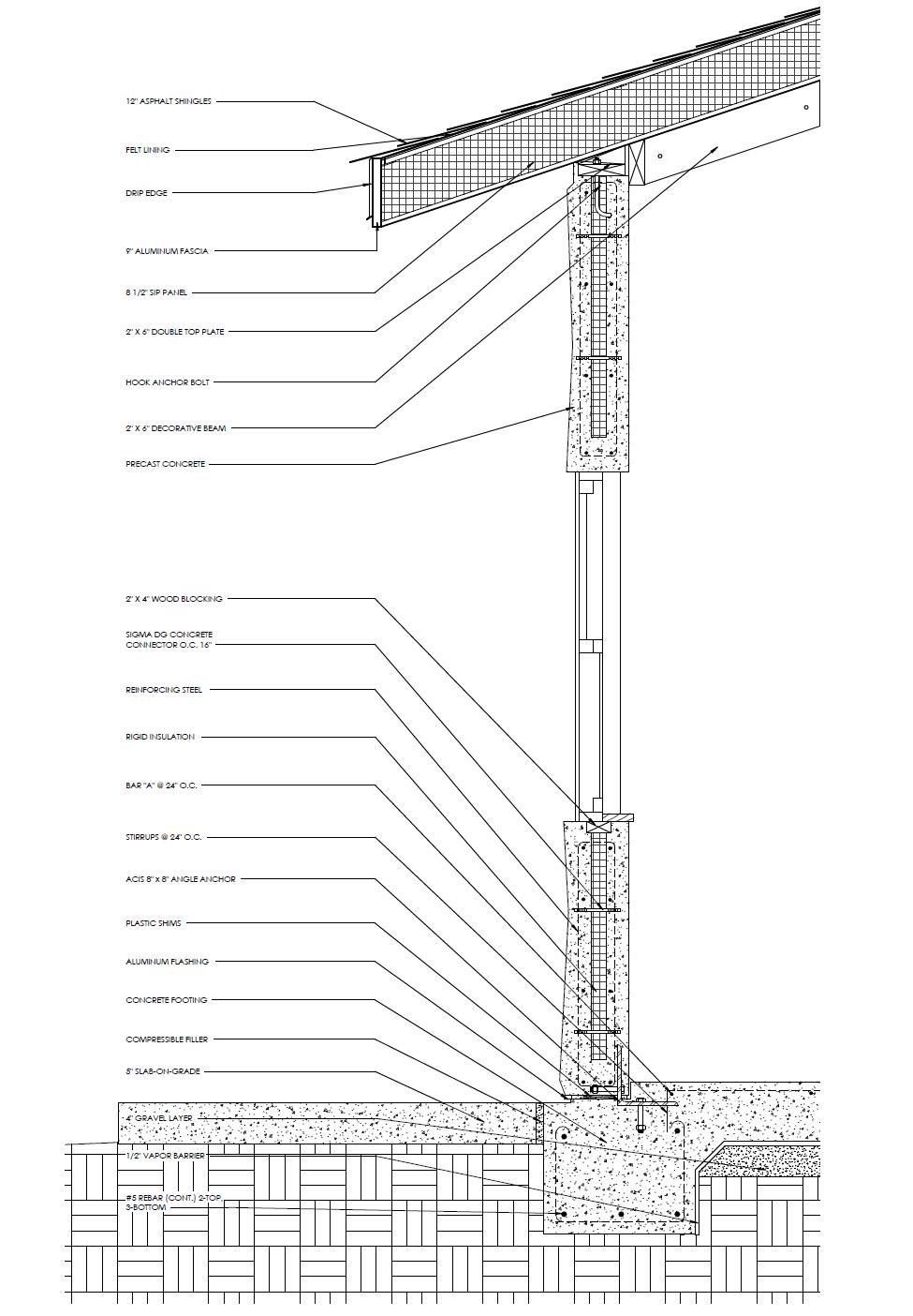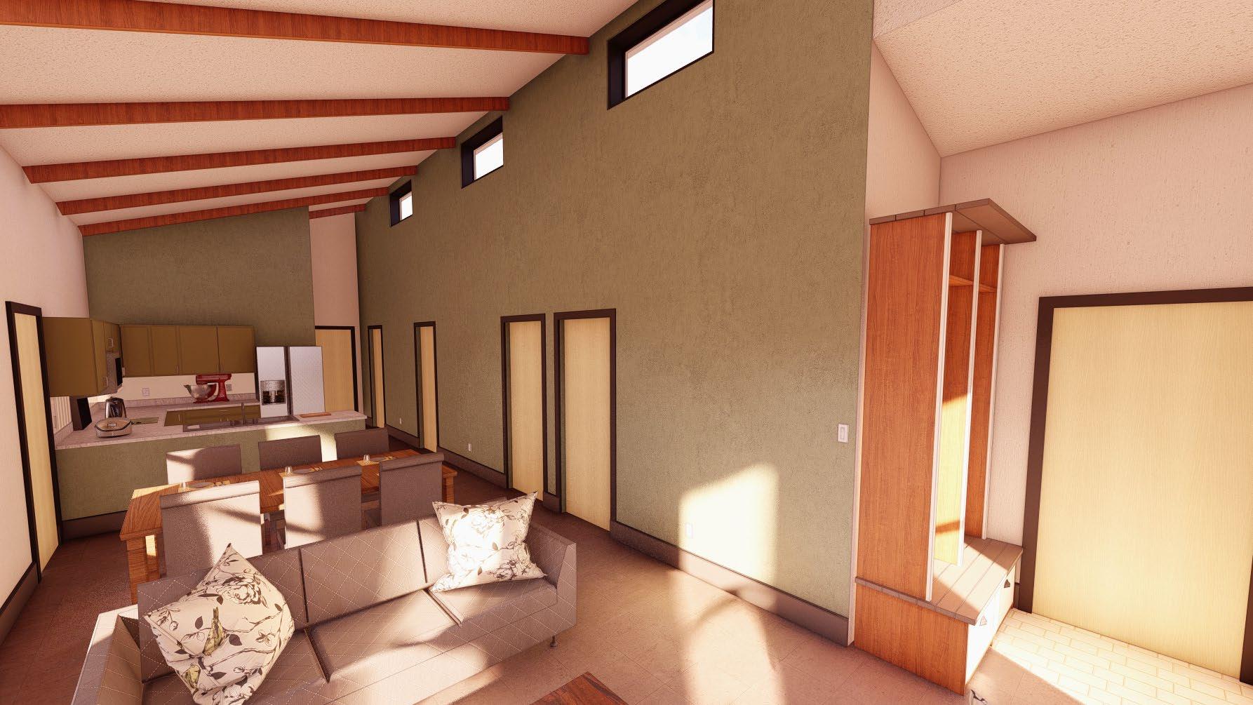 one of which is an ADA bathroom. The semi-public is opened to the sips panel above with its peak at 15’3”. The bedrooms have an 8 feet ceiling with attic space for HVAC. The exterior walls are sandwich panels with three inches of concrete on either side and two inches of rigid insulation while the interior walls are typical