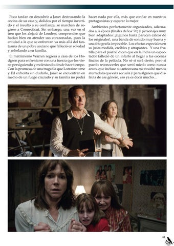 Ambientes perfectamente organizados, adecuados a la época (finales de los ’70) y personajes muy bien adaptados: ¡algunos hasta parecen calcos de los originales!, una banda de sonido muy buena y una fotografía impecable. Los efectos especiales en su justa medida, creíbles y atrapantes. Y una frutilla para el postre: dicen que en la India un especEl matrimonio Warren regresa a casa de los Ho- tador falleció de un infarto al llegar a las escenas dgson para enfrentarse con una fuerza que los vie- finales de la película. No sé si será cierto, pero sí ne persiguiendo y molestando desde hace tiempo. puedo reconocerles que sentí miedo como nunca Con la promesa de una tragedia que Lorraine teme antes, que incluso su antecesora me resultó menos y Ed enfrenta sin dudarlo, Janet se encuentran en aterradora que esta secuela y para alguien que dismedio de un fuego cruzado y su familia no podrá fruta de ese género, eso ya es decir mucho…
