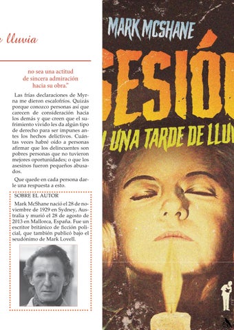e lluvia no sea una actitud de sincera admiración hacia su obra.” Las frías declaraciones de Myrna me dieron escalofríos. Quizás porque conozco personas así que carecen de consideración hacia los demás y que creen que el sufrimiento vivido les da algún tipo de derecho para ser impunes antes los hechos delictivos. Cuántas veces habré oído a personas afirmar que los delincuentes son pobres personas que no tuvieron mejores oportunidades; o que los asesinos fueron pequeños abusados. Que quede en cada persona darle una respuesta a esto. SOBRE EL AUTOR Mark McShane nació el 28 de noviembre de 1929 en Sydney, Australia y murió el 28 de agosto de 2013 en Mallorca, España. Fue un escritor británico de ficción policial, que también publicó bajo el seudónimo de Mark Lovell.