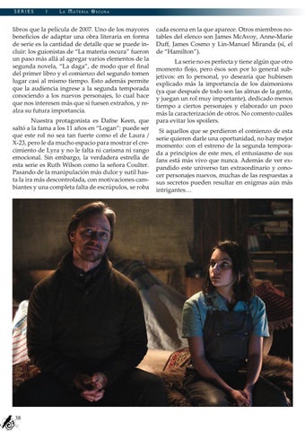 libros que la película de 2007. Uno de los mayores beneficios de adaptar una obra literaria en forma de serie es la cantidad de detalle que se puede incluir: los guionistas de “La materia oscura” fueron un paso más allá al agregar varios elementos de la segunda novela, “La daga”, de modo que el final del primer libro y el comienzo del segundo tomen lugar casi al mismo tiempo. Esto además permite que la audiencia ingrese a la segunda temporada conociendo a los nuevos personajes, lo cual hace que nos interesen más que si fuesen extraños, y realza su futura importancia. Nuestra protagonista es Dafne Keen, que saltó a la fama a los 11 años en “Logan”: puede ser que este rol no sea tan fuerte como el de Laura / X-23, pero le da mucho espacio para mostrar el crecimiento de Lyra y no le falta ni carisma ni rango emocional. Sin embargo, la verdadera estrella de esta serie es Ruth Wilson como la señora Coulter. Pasando de la manipulación más dulce y sutil hasta la ira más descontrolada, con motivaciones cambiantes y una completa falta de escrúpulos, se roba