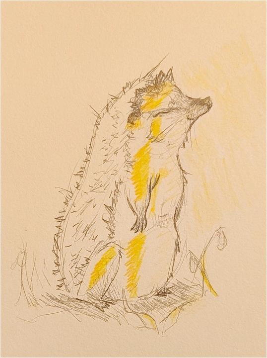 Un gentil crépitement de pluie casse le silence Les petites gouttestombentsurleschampsetmouillentl’écorcedesarbres nusdepuislespremierscoupsdel’hiver Laboueremue Lesvers de terre, cherchant la pluie fraîche, émergent – c’est un bon changement de la gelée qui avait durci leur sol. Cependant, les versnesontpaslesseulsquisesontréveillés.Danslenoir,deux petitsyeuxluisentetregardentdeleurcachettedanslahaieles vers avec intensité et faim Poussant un grognement, le corps courtaudentredanslemauvaistemps.Sesjambessontcourtes et se sentent raides après des mois d’hibernation. Son souffle blanc coule et il n’est pas tout à fait heureux de sentir de nouveaulapluietombantgoutteàgoutteentrelesépinesdeson dos