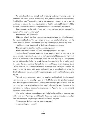 We gained our feet and circled, both breathing hard and streaming sweat. He rubbed his left elbow, his eyes never leaving mine, and with a fierce exultation I knew that I had hurt him. That could be used to my advantage. I ceased circling to my left and began to move in the opposite direction, so that his weakened left arm would be exposed. Yanni saw what I was doing and turned his torso to shield his left side. “Keep your eyes to the study of your black books and your barbaric tongues,” he muttered. “My sister is not for you.” “She can speak her own words.” “I like you, Abdul. For these past seven years you’ve been like a brother to me. But we are not brothers. You are a singer of songs and a maker of verses. I am the crown prince of Yemen. Do not think to tie my blood to yours through my sister.” I could not oppose his strength or skill. My only weapon was guile. “Narisa is a playmate of my childhood, nothing more.” “She has become a woman, and your time of playing with her is past.” He threw himself upon me, intending to use his sheer power to force me to my knees. Instead of resisting, I drew him to my breast and fell backward, my right foot planted in his stomach. His own weight threw him over my body as I straightened my leg, adding to his flight. He struck the gravel path with the flat of his back and slid across the stones cursing, then rolled to his side. Quickly, before he could stand, I darted after him and fastened a chokehold around his neck, forcing his face into the gravel. It was the same hold Yanni had taught me in our childhood, when he delighted to throw me across the lawn again and again until I could no longer rise to my feet. The pink stones, though not sharp, cut his cheek and forehead. Blood streamed from his nose, and his lower lip began to swell. My forearm tightened on his thick neck. He struggled to throw me off, cursing and spitting a spray of blood from his cut lip. At last, he relaxed and slapped my arm. I tightened the hold, thinking of the many times he had used it to render me unconscious. Again he slapped my arm, and again with a frantic motion. Reluctantly, I released him and stood quickly before he could vent his annoyance with a petty blow. Yanni got up rubbing his throat and tried to smile, but his swollen lip made the expression grotesque. He spat blood into the grass. “You’ve gained skill since the last time we wrestled.” “A man can improve himself.”