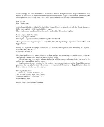 Karmic Astrology: Past Lives, Present Loves © 2007 by Ruth Aharoni. All rights reserved. No part of this book may be used or reproduced in any manner whatsoever, including Internet usage, without written permission from Llewellyn Publications except in the case of brief quotations embodied in critical articles and reviews. First Edition First Printing, 2007 Originally published in 1999 by OrâAm Publishing House, Tel Aviv, Israel, under the title The Karmic Connection. Hebrew copyright © 1999 OrâAm Publishing House. Many thanks to the translator, Miriam Erez, who rendered the Hebrew into English. Cover art (planets) © PhotoDisc Cover design by Ellen Dahl Llewellyn is a registered trademark of Llewellyn Worldwide, Ltd. The Edgar Cayce readings in chapter 11 are © 1971, 1993, 2004 by the Edgar Cayce Foundation and are used by permission. Library of Congress Cataloging-in-Publication Data for Karmic Astrology is on file at the Library of Congress. ISBN 13: 978-0-7387-0967-3 ISBN 10: 0-7387-0967-0 Llewellyn Worldwide does not participate in, endorse, or have any authority or responsibility concerning private business transactions between our authors and the public. All mail addressed to the author is forwarded but the publisher cannot, unless specifically instructed by the author, give out an address or phone number. Any Internet references contained in this work are current at publication time, but the publisher cannot guarantee that a specific location will continue to be maintained. Please refer to the publisherâs website for links to authorsâ websites and other sources. Llewellyn Publications A Division of Llewellyn Worldwide, Ltd. 2143 Wooddale Drive, Dept. 0-7387-0967-0 Woodbury, Minnesota 55125-2989, U.S.A. www.llewellyn.com Printed in the United States of America