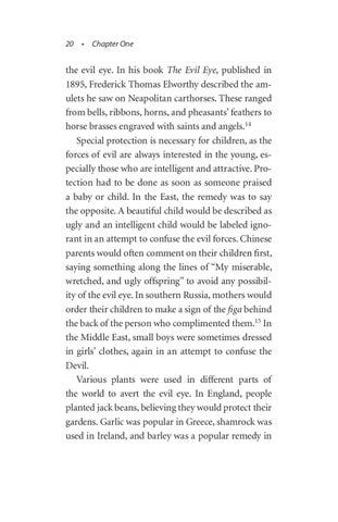 the evil eye. In his book The Evil Eye, published in 1895, Frederick Thomas Elworthy described the amulets he saw on Neapolitan carthorses. These ranged from bells, ribbons, horns, and pheasantsâ feathers to horse brasses engraved with saints and angels.14 Special protection is necessary for children, as the forces of evil are always interested in the young, especially those who are intelligent and attractive. Protection had to be done as soon as someone praised a baby or child. In the East, the remedy was to say the opposite. A beautiful child would be described as ugly and an intelligent child would be labeled ignorant in an attempt to confuse the evil forces. Chinese parents would often comment on their children first, saying something along the lines of âMy miserable, wretched, and ugly offspringâ to avoid any possibility of the evil eye. In southern Russia, mothers would order their children to make a sign of the figa behind the back of the person who complimented them.15 In the Middle East, small boys were sometimes dressed in girlsâ clothes, again in an attempt to confuse the Devil. Various plants were used in different parts of the world to avert the evil eye. In England, people planted jack beans, believing they would protect their gardens. Garlic was popular in Greece, shamrock was used in Ireland, and barley was a popular remedy in