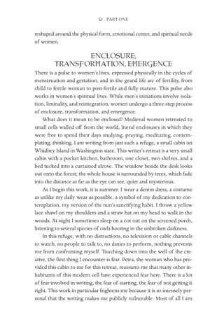 There is a pulse to women’s lives, expressed physically in the cycles of menstruation and gestation, and in the grand life arc of fertility, from child to fertile woman to post-fertile and fully mature. This pulse also works in women’s spiritual lives. While men’s initiations involve isolation, liminality, and reintegration, women undergo a three-step process of enclosure, transformation, and emergence. What does it mean to be enclosed? Medieval women retreated to small cells walled off from the world, literal enclosures in which they were free to spend their days studying, praying, meditating, contemplating, thinking. I am writing from just such a refuge, a small cabin on Whidbey Island in Washington state. This writer’s retreat is a very small cabin with a pocket kitchen, bathroom, one closet, two shelves, and a bed tucked into a curtained alcove. The window beside the desk looks out onto the forest; the whole house is surrounded by trees, which fade into the distance as far as the eye can see, quiet and mysterious. As I begin this work, it is summer. I wear a denim dress, a costume as unlike my daily wear as possible, a symbol of my dedication to contemplation, my version of the nun’s sanctifying habit. I throw a yellow lace shawl on my shoulders and a straw hat on my head to walk in the woods. At night I sometimes sleep on a cot out on the screened porch, listening to several species of owls hooting in the unbroken darkness. In this refuge, with no distractions, no television or cable channels to watch, no people to talk to, no duties to perform, nothing prevents me from confronting myself. Touching down into the well of the creative, the first thing I encounter is fear. Petra, the woman who has provided this cabin to me for this retreat, reassures me that many other inhabitants of this modern cell have experienced fear here. There is a lot of fear involved in writing, the fear of starting, the fear of not getting it right. This work in particular frightens me because it is so intensely personal that the writing makes me publicly vulnerable. Most of all I am