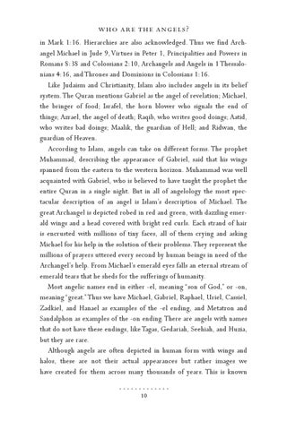 who are the angels? in Mark 1:16. Hierarchies are also acknowledged. Thus we find Archangel Michael in Jude 9, Virtues in Peter 1, Principalities and Powers in Romans 8:38 and Colossians 2:10, Archangels and Angels in 1 Thessalonians 4:16, and Thrones and Dominions in Colossians 1:16. Like Judaism and Christianity, Islam also includes angels in its belief system. The Quran mentions Gabriel as the angel of revelation; Michael, the bringer of food; Israfel, the horn blower who signals the end of things; Azrael, the angel of death; Raqib, who writes good doings; Aatid, who writes bad doings; Maalik, the guardian of Hell; and Ridwan, the guardian of Heaven. According to Islam, angels can take on different forms. The prophet Muhammad, describing the appearance of Gabriel, said that his wings spanned from the eastern to the western horizon. Muhammad was well acquainted with Gabriel, who is believed to have taught the prophet the entire Quran in a single night. But in all of angelology the most spectacular description of an angel is Islam’s description of Michael. The great Archangel is depicted robed in red and green, with dazzling emerald wings and a head covered with bright red curls. Each strand of hair is encrusted with millions of tiny faces, all of them crying and asking Michael for his help in the solution of their problems. They represent the millions of prayers uttered every second by human beings in need of the Archangel’s help. From Michael’s emerald eyes falls an eternal stream of emerald tears that he sheds for the sufferings of humanity. Most angelic names end in either -el, meaning “son of God,” or -on, meaning “great.” Thus we have Michael, Gabriel, Raphael, Uriel, Cassiel, Zadkiel, and Hanael as examples of the -el ending, and Metatron and Sandalphon as examples of the -on ending. There are angels with names that do not have these endings, like Tagas, Gedariah, Seehiah, and Huzia, but they are rare. Although angels are often depicted in human form with wings and halos, these are not their actual appearances but rather images we have created for them across many thousands of years. This is known 10