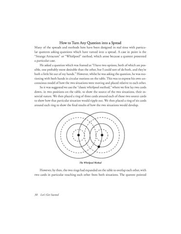 How to Turn Any Question into a Spread Many of the spreads and methods here have been designed in real time with particular querents asking questions which have turned into a spread. A case in point is the “Strange Attractors” or “Whirlpool” method, which arose because a querent presented a particular case. He asked a question which was framed as “I have two options, both of which are possible, one probably more desirable than the other, but I could sort of do both, and they’re both a little bit out of my hands.” However, whilst he was asking the question, he was motioning with both hands in circular motions on the table. This was to express his own unconscious model of how the two situations were moving and placed relative to each other. So it was suggested we use the “classic whirlpool method,” where we first lay two cards down, in two positions on the table, to show the source of the two situations, their essential nature. We then placed a ring of three cards around each of those two source cards to show how that particular situation would ripple out. We then placed a ring of six cards around each ring to show the final results of how the two situations would develop.