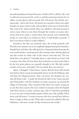 misunderstanding developed because a hollow hill is called a sidhe, and it is likewise pronounced shee, and it is said that sometimes faeries live in sidhes, as may ghosts and even gods. No, Sith means “the silently moving people,” and to the Scots, the faeries are a people in their own right, though not quite of this world, and not likely to be seen or heard unless they wish to be. And certainly these two children, who had seemed as real as stone when we saw them through the window on sunny afternoons had never made a sound when they passed, and vanished like smoke in wind when we looked for them. I told Natalia seriously, “I don’t even know if they’re really children.” Around us the day was perfectly calm, the woods perfectly still. This late into autumn, not even songbirds skipped among the branches, though here and there the odd squirrel or chipmunk darted among the roots and branches, stocking up for the coming winter. Natalia glanced into the woods on either side of the narrow trail and said, “Do you think they were ghosts?” I thought about it, then shook my head. Call it instinct, but when I’d seen them they looked too content and solid to be the lost spirits ghosts are typically thought to be. She half smiled, wonder in her eyes, and asked, “Do you think they were faeries?” Again, I shrugged. “I don’t know, sweetie. But the Scots folk around here believe these woods are haunted by faeries. So do the Mi’kmaq, who call them the Megumoowesoo. And, you know, the Acadians do, too, and call them les feys.” I spoke fair French by dint of my Cajun ancestry and I had spoken with the Acadians on many occasions, up around the village of Cheticamp. They seemed to like that I was Cajun, seeing me as one their lost cousins who were exiled to Louisiana when the English took Nova Scotia so many centuries ago, and so I had been privileged to sit in on some of their kitchen parties which were, like ceilidhs, full of music and old stories. “It seems everyone who lives around here believes there is magic in these woods. That’s why it used to be called Coille n’an Sithchean—the faerie woods. It’s like it’s between the worlds.”