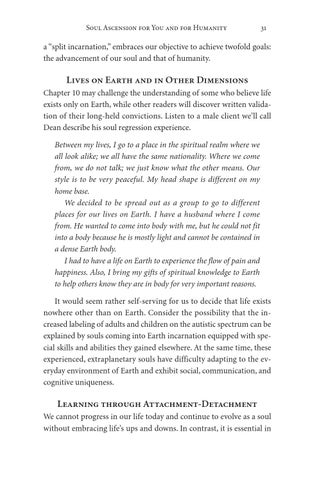 Lives on Earth and in Other Dimensions Chapter 10 may challenge the understanding of some who believe life exists only on Earth, while other readers will discover written validation of their long-held convictions. Listen to a male client we’ll call Dean describe his soul regression experience. Between my lives, I go to a place in the spiritual realm where we all look alike; we all have the same nationality. Where we come from, we do not talk; we just know what the other means. Our style is to be very peaceful. My head shape is different on my home base. We decided to be spread out as a group to go to different places for our lives on Earth. I have a husband where I come from. He wanted to come into body with me, but he could not fit into a body because he is mostly light and cannot be contained in a dense Earth body. I had to have a life on Earth to experience the flow of pain and happiness. Also, I bring my gifts of spiritual knowledge to Earth to help others know they are in body for very important reasons. It would seem rather self-serving for us to decide that life exists nowhere other than on Earth. Consider the possibility that the increased labeling of adults and children on the autistic spectrum can be explained by souls coming into Earth incarnation equipped with special skills and abilities they gained elsewhere. At the same time, these experienced, extraplanetary souls have difficulty adapting to the everyday environment of Earth and exhibit social, communication, and cognitive uniqueness.