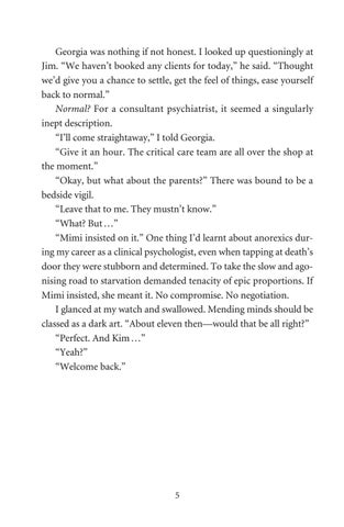 Georgia was nothing if not honest. I looked up questioningly at Jim. “We haven’t booked any clients for today,” he said. “Thought we’d give you a chance to settle, get the feel of things, ease yourself back to normal.” Normal? For a consultant psychiatrist, it seemed a singularly inept description. “I’ll come straightaway,” I told Georgia. “Give it an hour. The critical care team are all over the shop at the moment.” “Okay, but what about the parents?” There was bound to be a bedside vigil. “Leave that to me. They mustn’t know.” “What? But …” “Mimi insisted on it.” One thing I’d learnt about anorexics during my career as a clinical psychologist, even when tapping at death’s door they were stubborn and determined. To take the slow and agonising road to starvation demanded tenacity of epic proportions. If Mimi insisted, she meant it. No compromise. No negotiation. I glanced at my watch and swallowed. Mending minds should be classed as a dark art. “About eleven then—would that be all right?” “Perfect. And Kim …” “Yeah?” “Welcome back.”