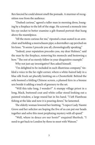 Rex fancied he could almost smell the pomade. A murmur of recognition rose from the audience. “Dashed curious,” agreed a taller man in morning dress, lounging by a fireplace to the left of the stage. He screwed a monocle into his eye socket to better examine a gilt-framed portrait that hung above the mantelpiece. “All the more curious for me,” riposted a man seated in an armchair and holding a meerschaum pipe; a deerstalker cap perched on his knee. “It seems I precede you all, chronologically speaking.” “Indeed, your reputation precedes you, my dear Holmes,” said the man by the fireplace, removing his monocle and bestowing a bow. “The rest of us merely follow in your disquisitive example.” Why not just say investigative? Rex asked himself. “I’m delighted to be included in such illustrious company,” tinkled a voice in the far-right corner, where a white-haired lady in a blue silk frock sat placidly knitting on a Chesterfield. Behind the sofa loomed a folding Chinese screen, a plumed fern in a bronze urn beside it adding a touch of greenery to the set. “Will this take long, I wonder?” A stumpy village priest in a long, black, buttoned coat and white collar stood looking out a painted window, a large round hat in his hand. “I left Flambeau fishing at the lake and now it is pouring down,” he lamented. The elderly woman lowered her knitting. “I expect Lady Naomi Grove and her solicitor are hoping the five of us can put our heads together and solve this most perplexing mystery with all speed.” “Well, where in deuce are our hosts?” enquired Sherlock. “I need to get back to London by three to meet with Watson.”